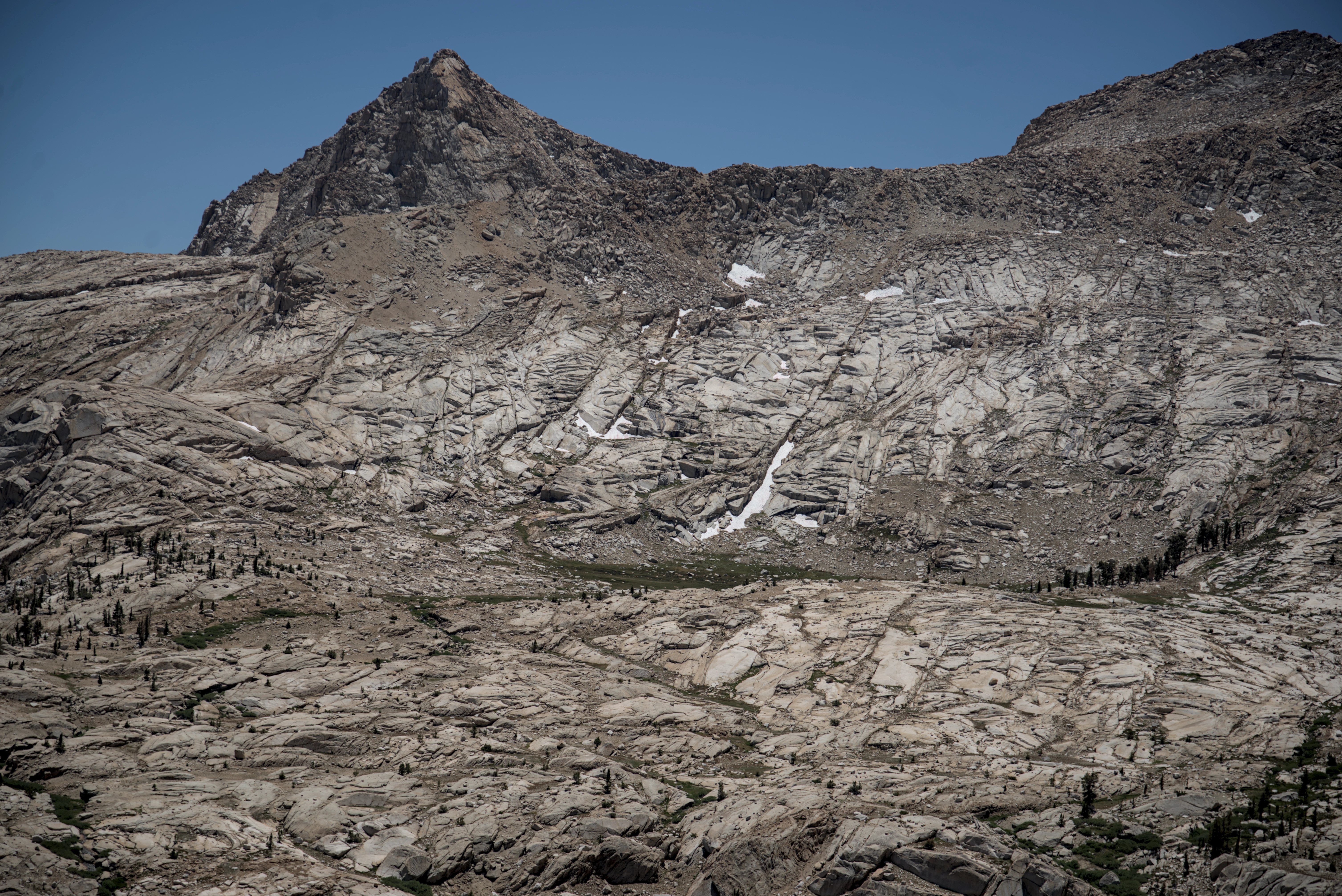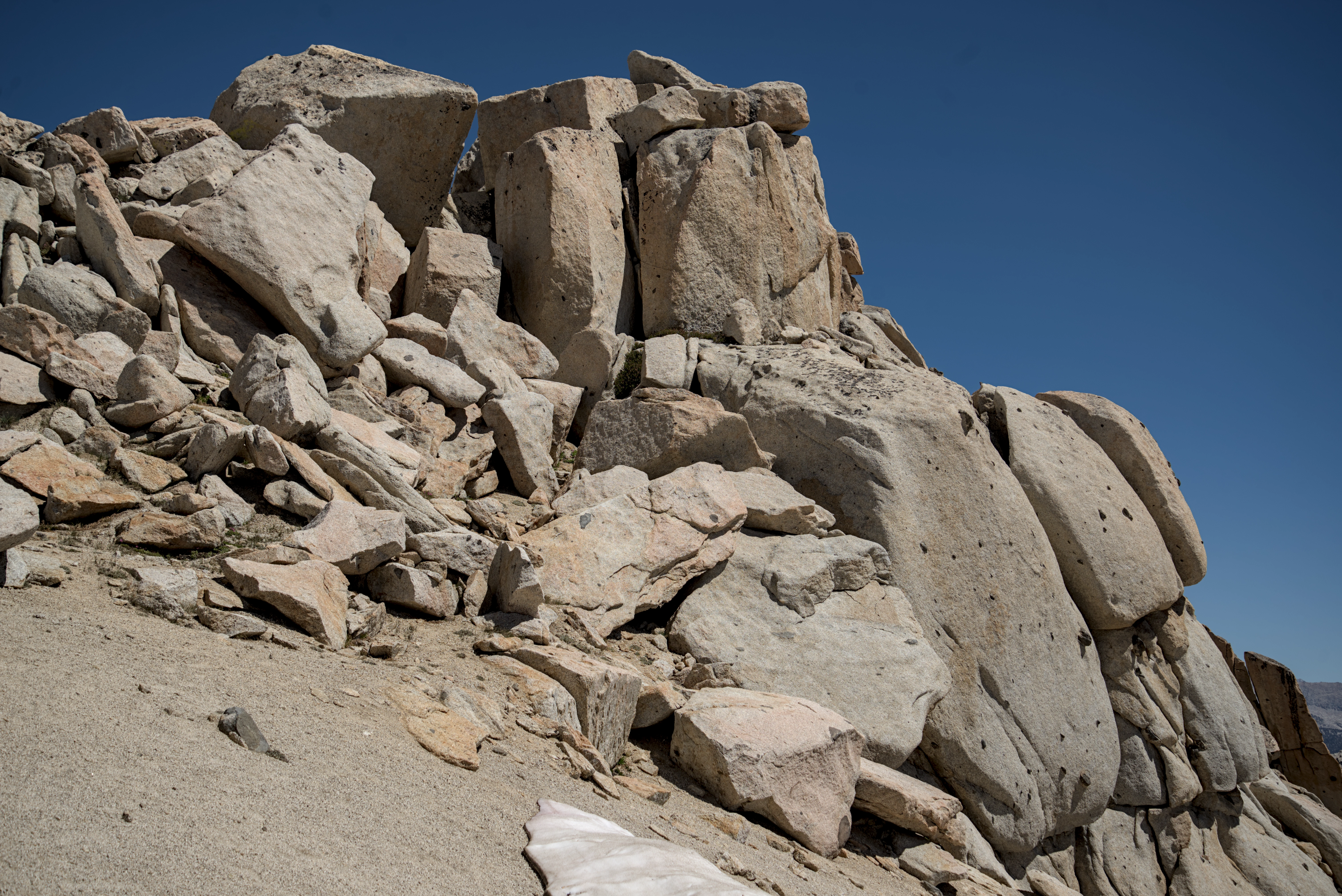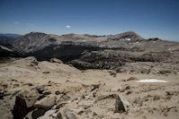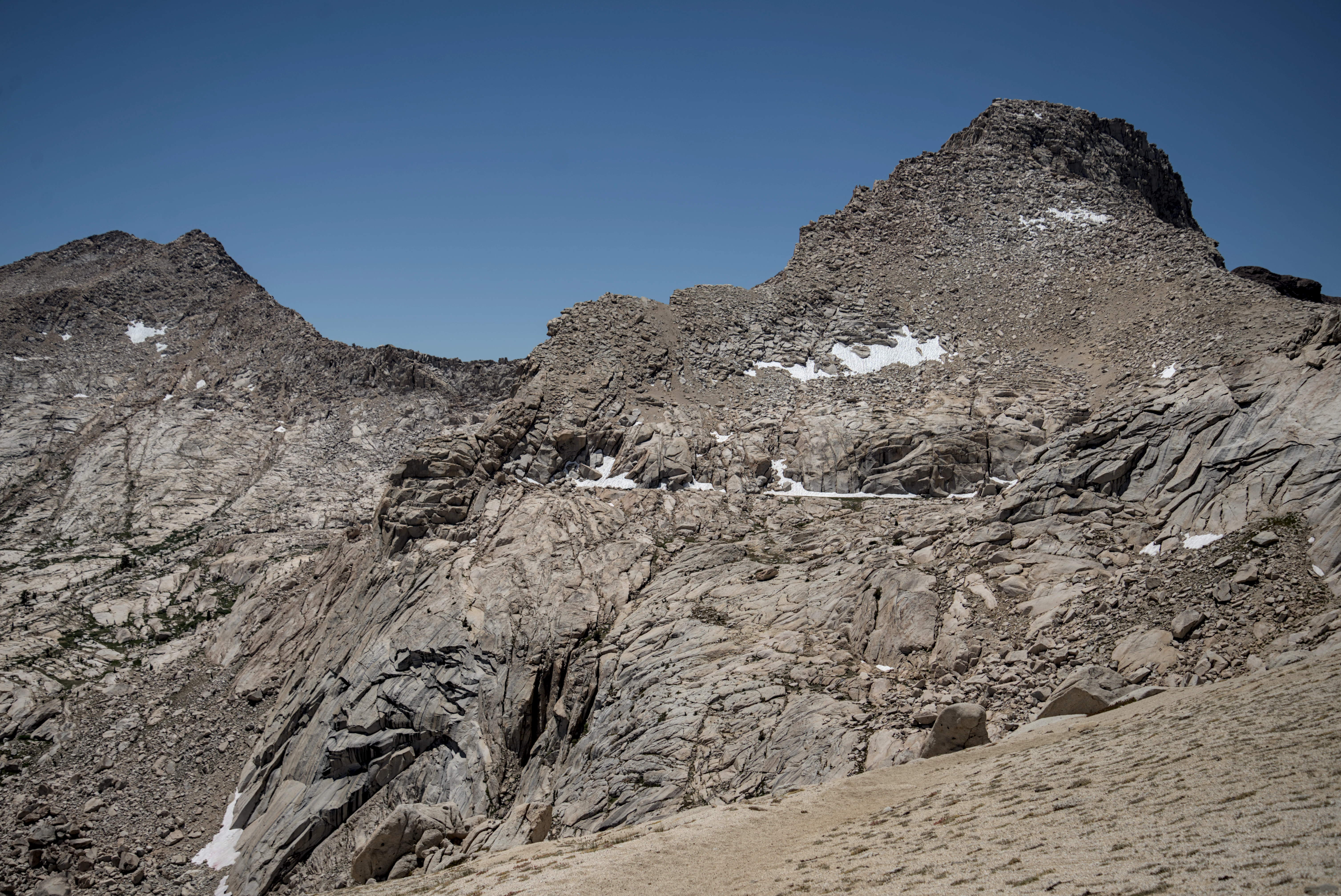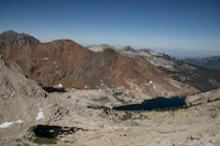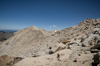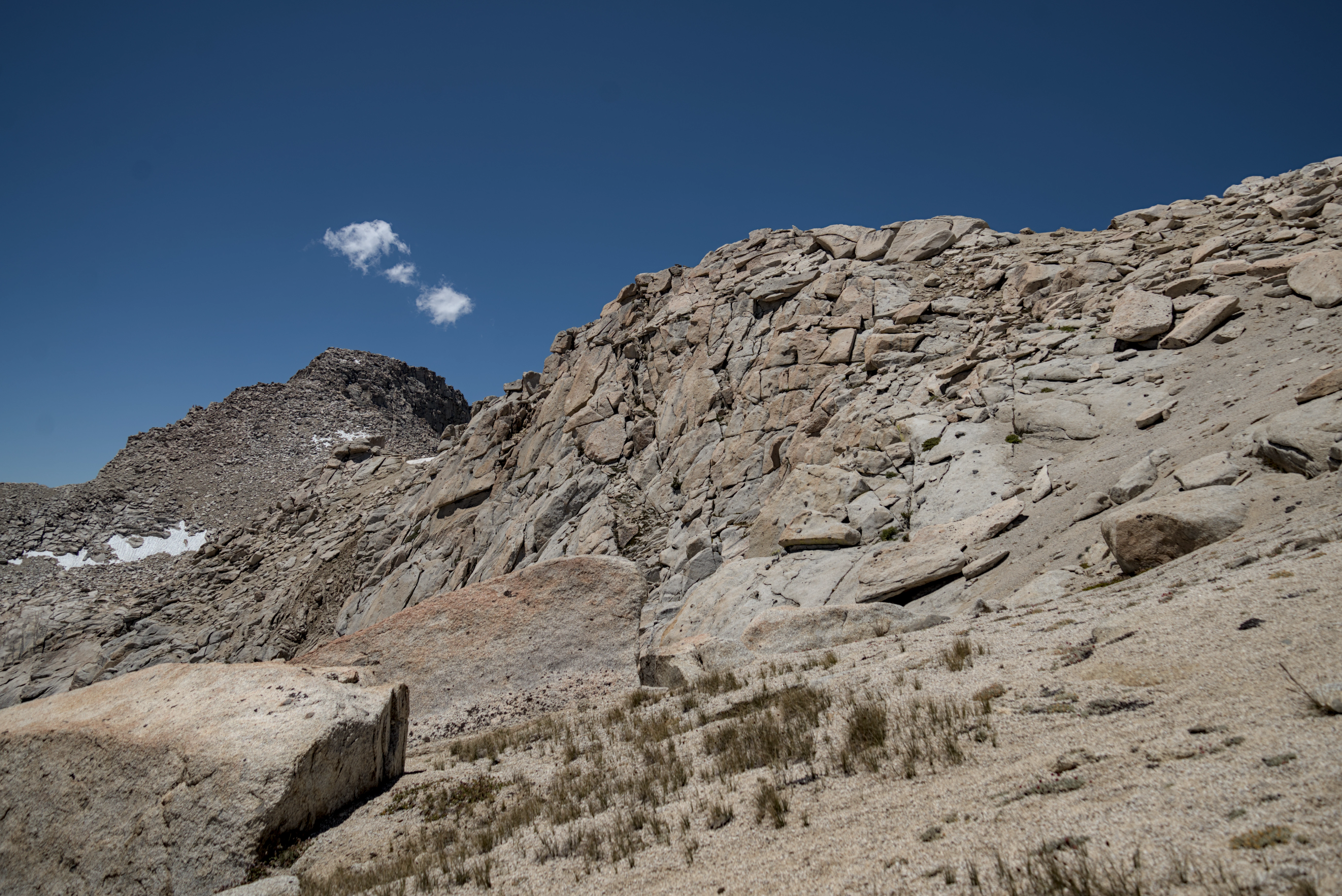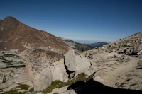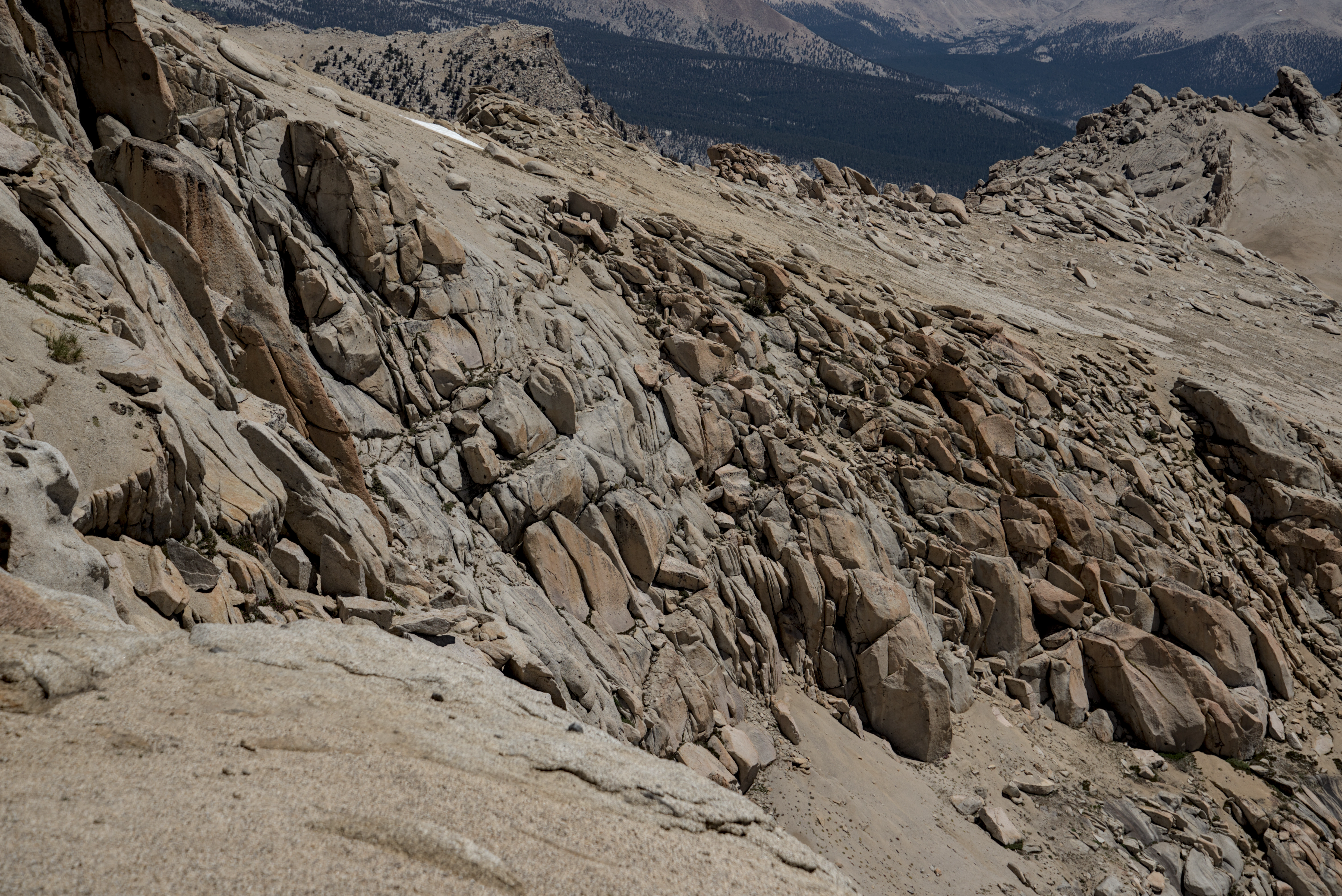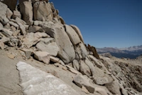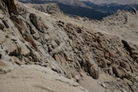 Shortly before reaching Franklin Pass, we reached the ridgeline and were able to see the view to the east. From the vantage point of this photo, much of the remaining hike is visible. Whitney is the large peak in the backgroud, just left of centre. Pacman Lake, where we camped the night before our ascent, is at the foot the cliffs. The valley with Crabtree Meadows stretches from there to the lower left into the Kern River valley, which runs to the right behind the rock outcrop in the centre.