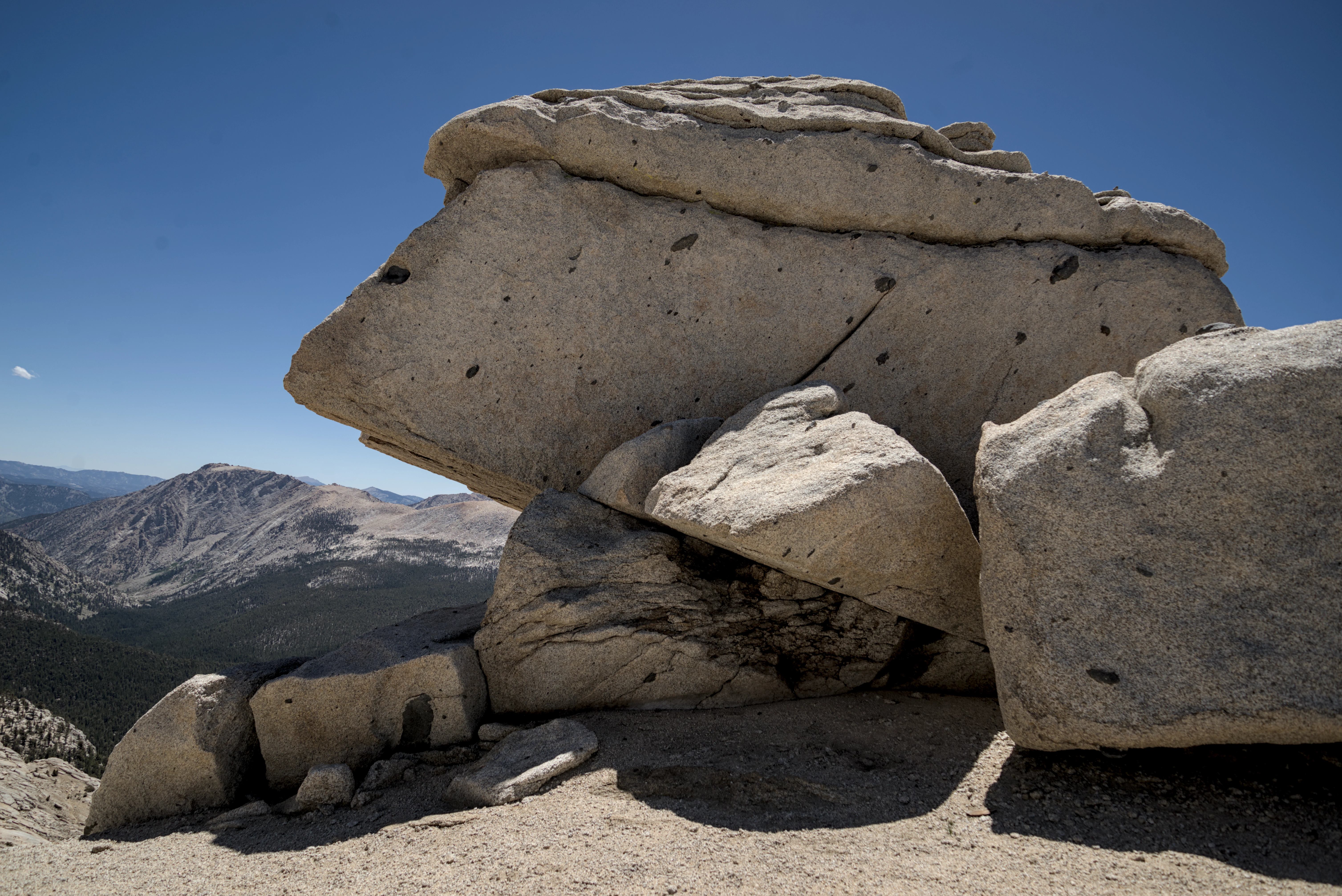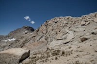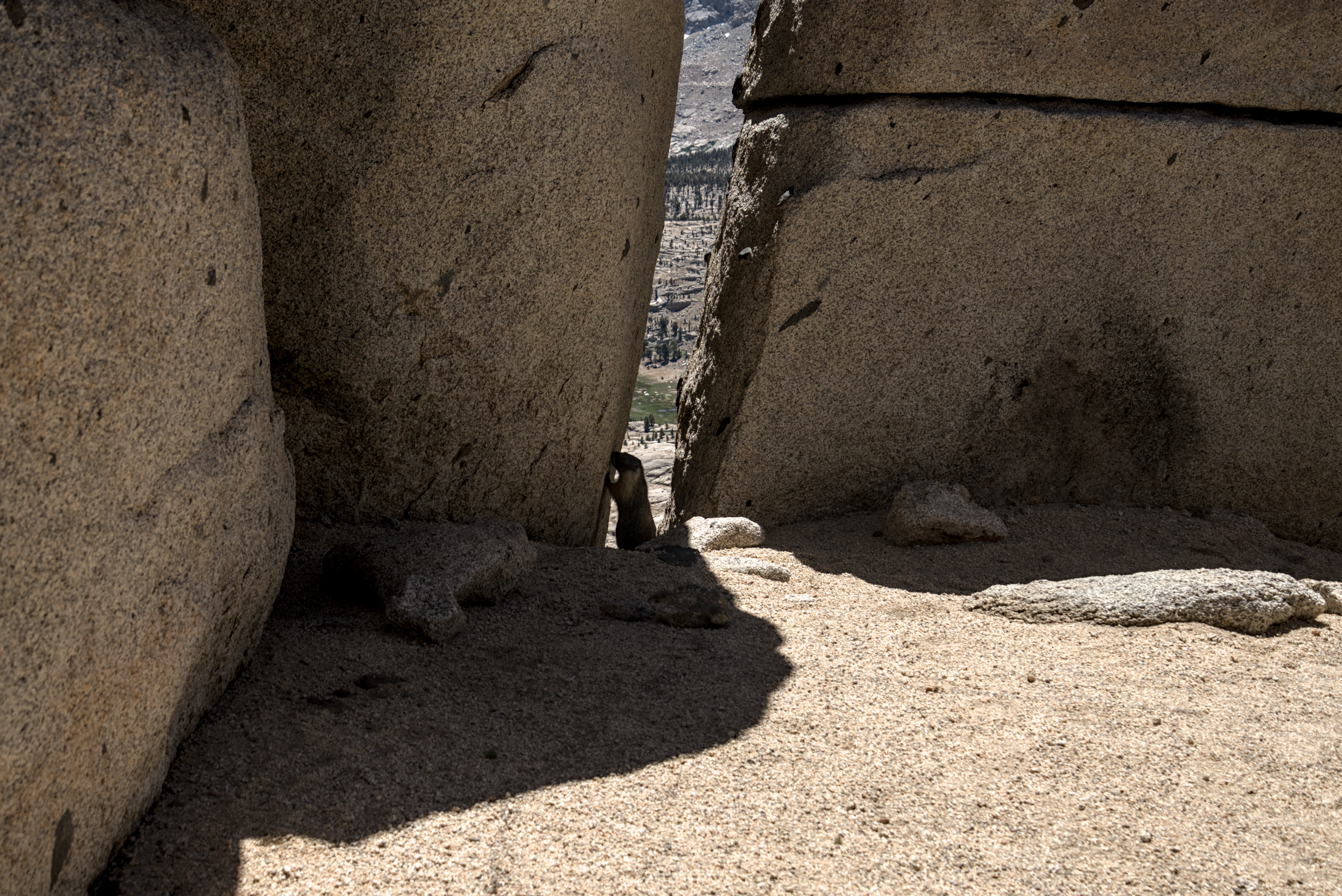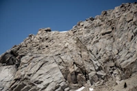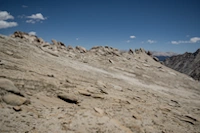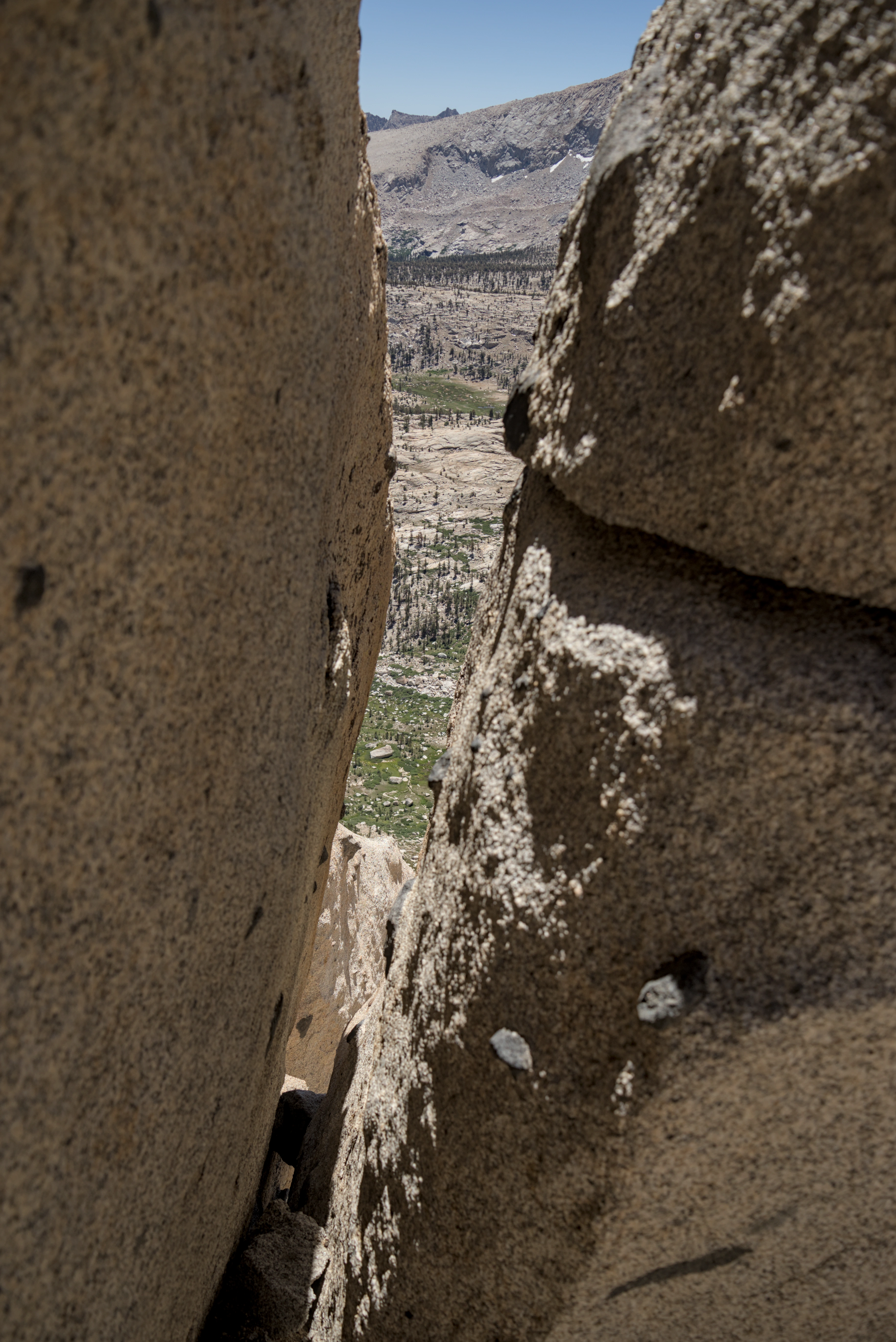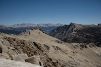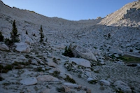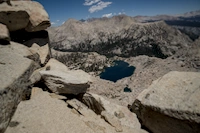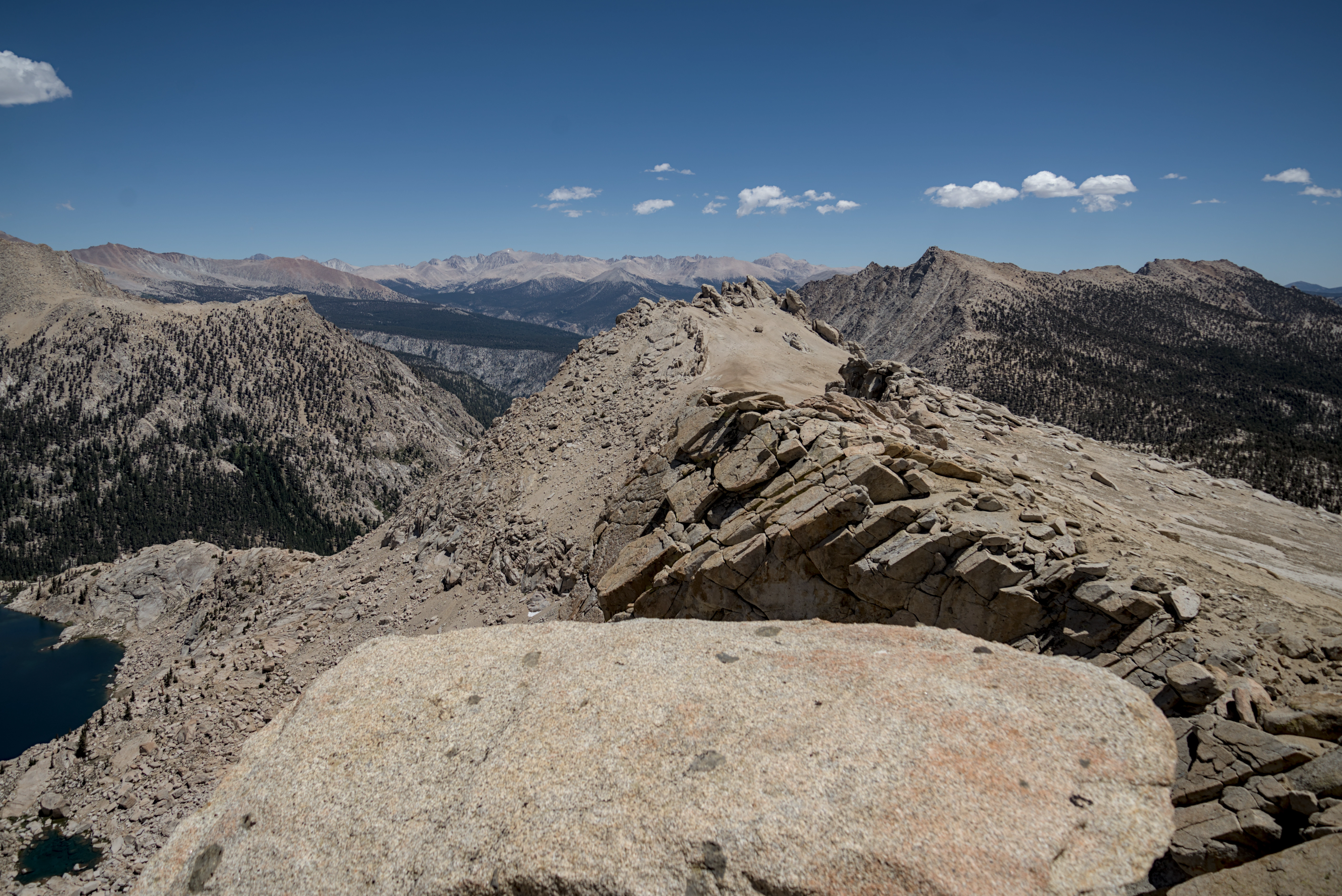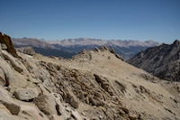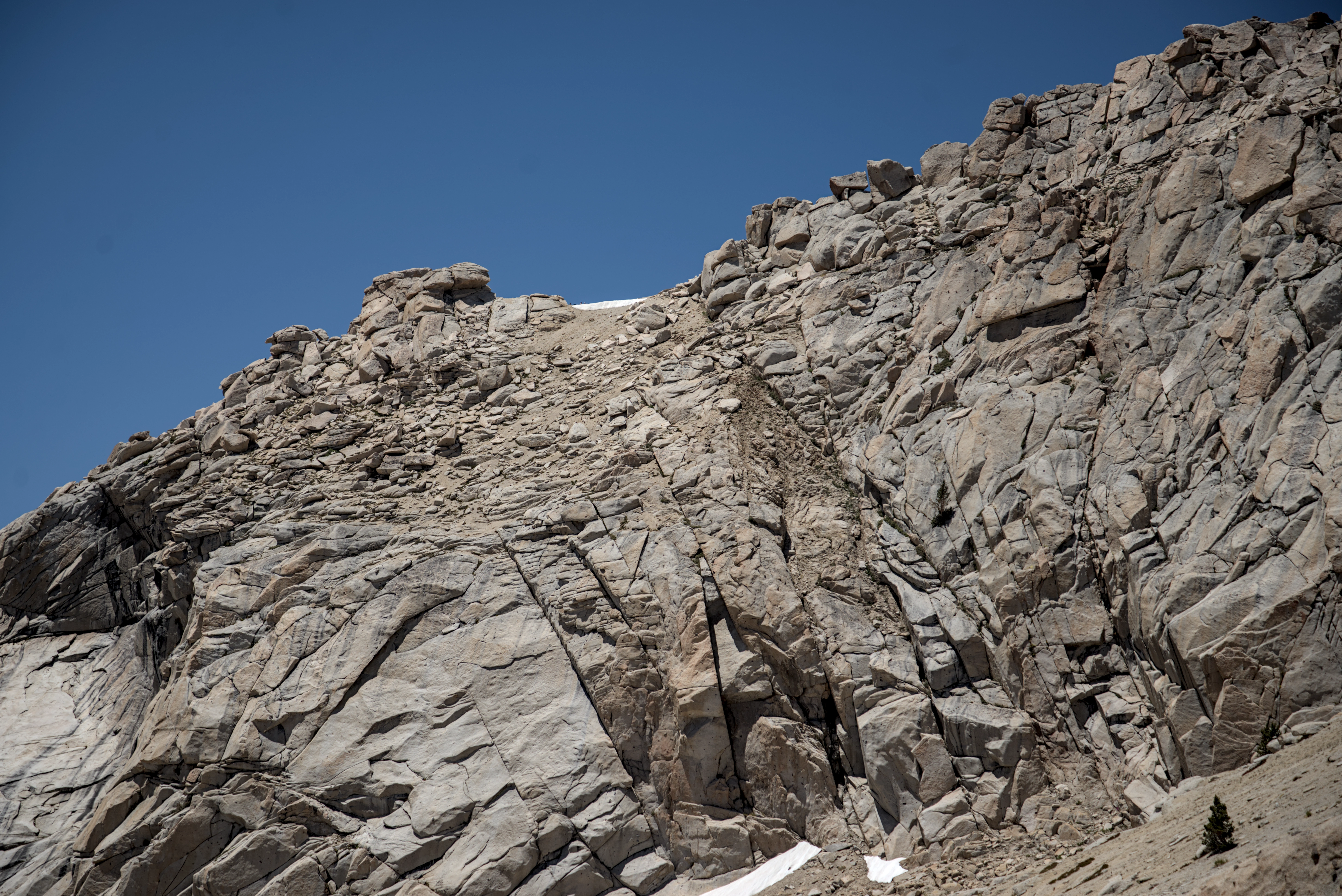Shortly before reaching Franklin Pass, we reached the ridgeline and were able to see the view to the east. From the vantage point of this photo, much of the remaining hike is visible. Whitney is the large peak in the backgroud, just left of centre. Pacman Lake, where we camped the night before our ascent, is at the foot the cliffs. The valley with Crabtree Meadows stretches from there to the lower left into the Kern River valley, which runs to the right behind the rock outcrop in the centre.