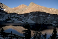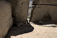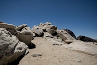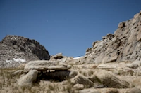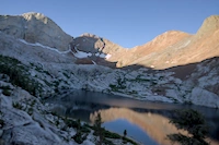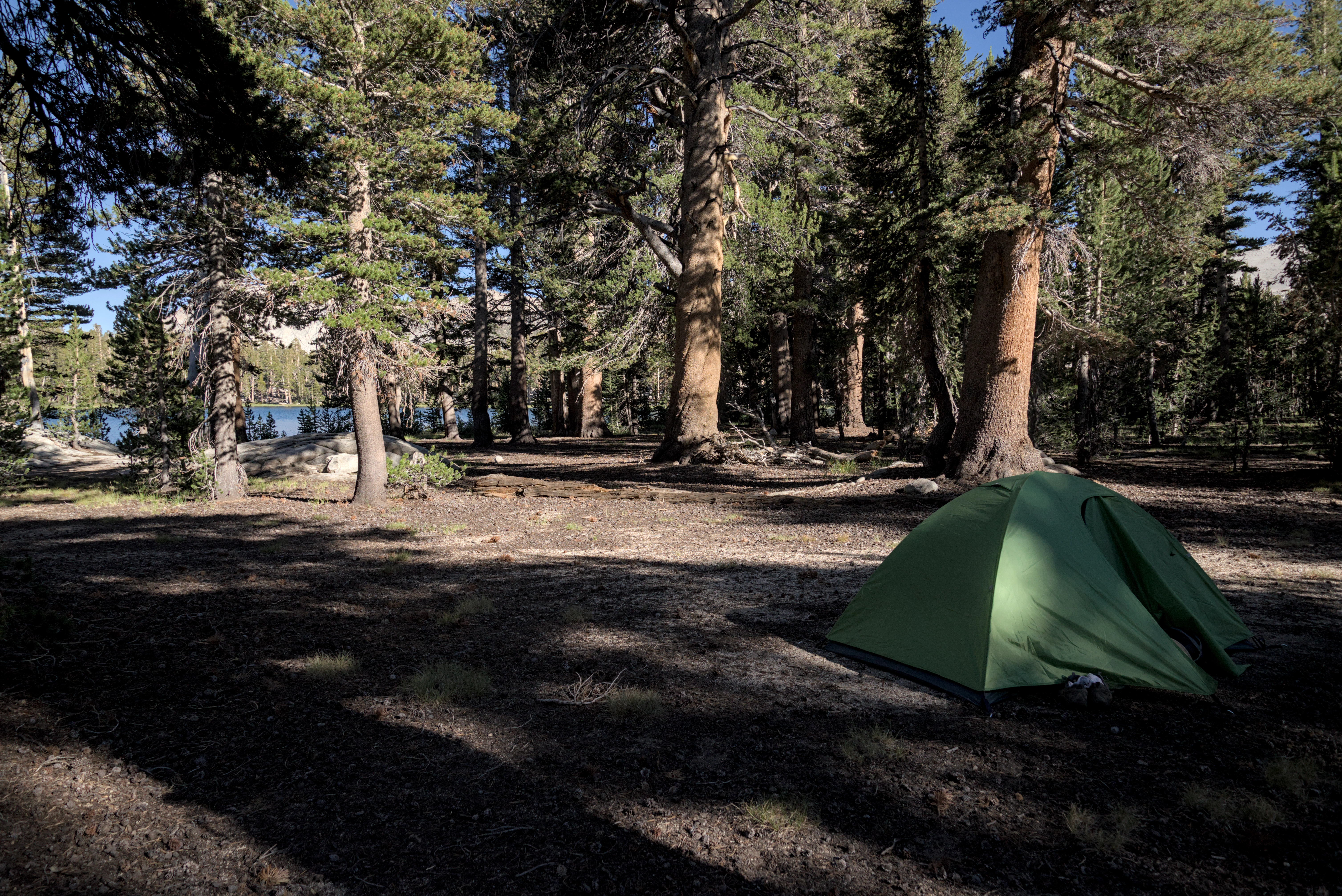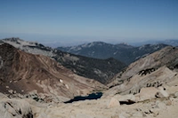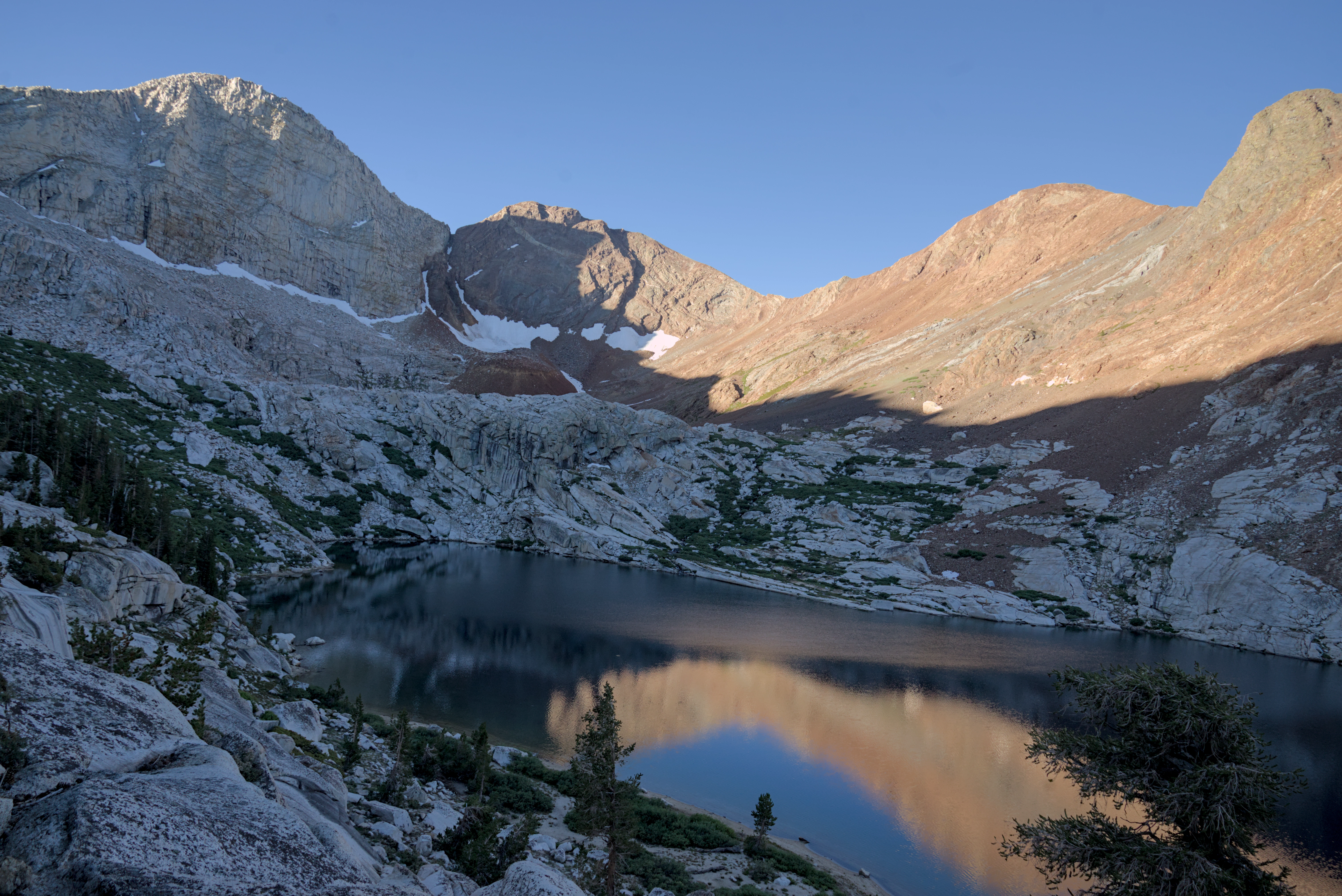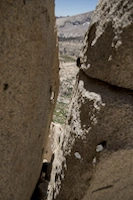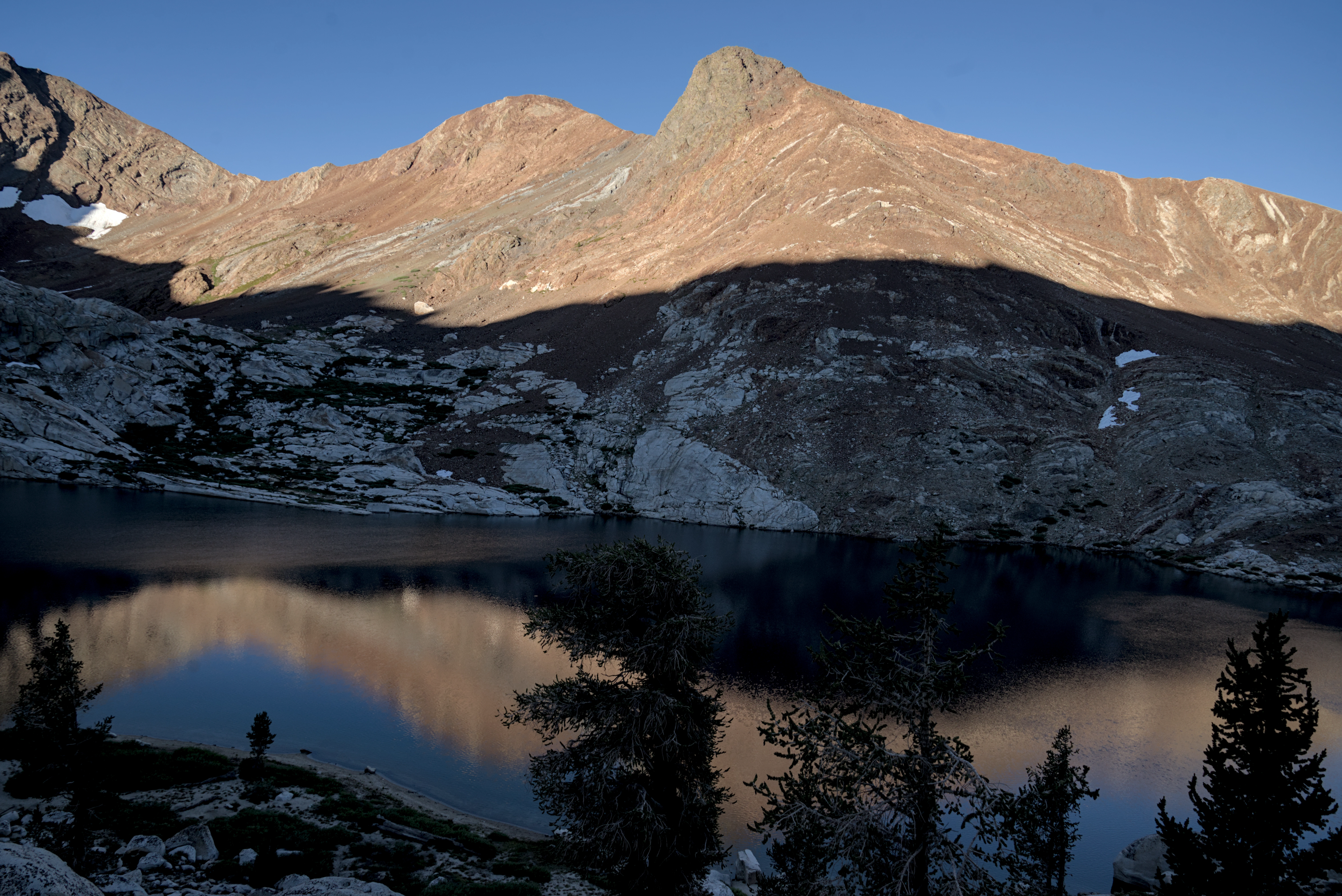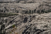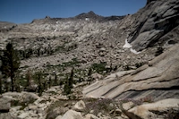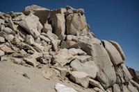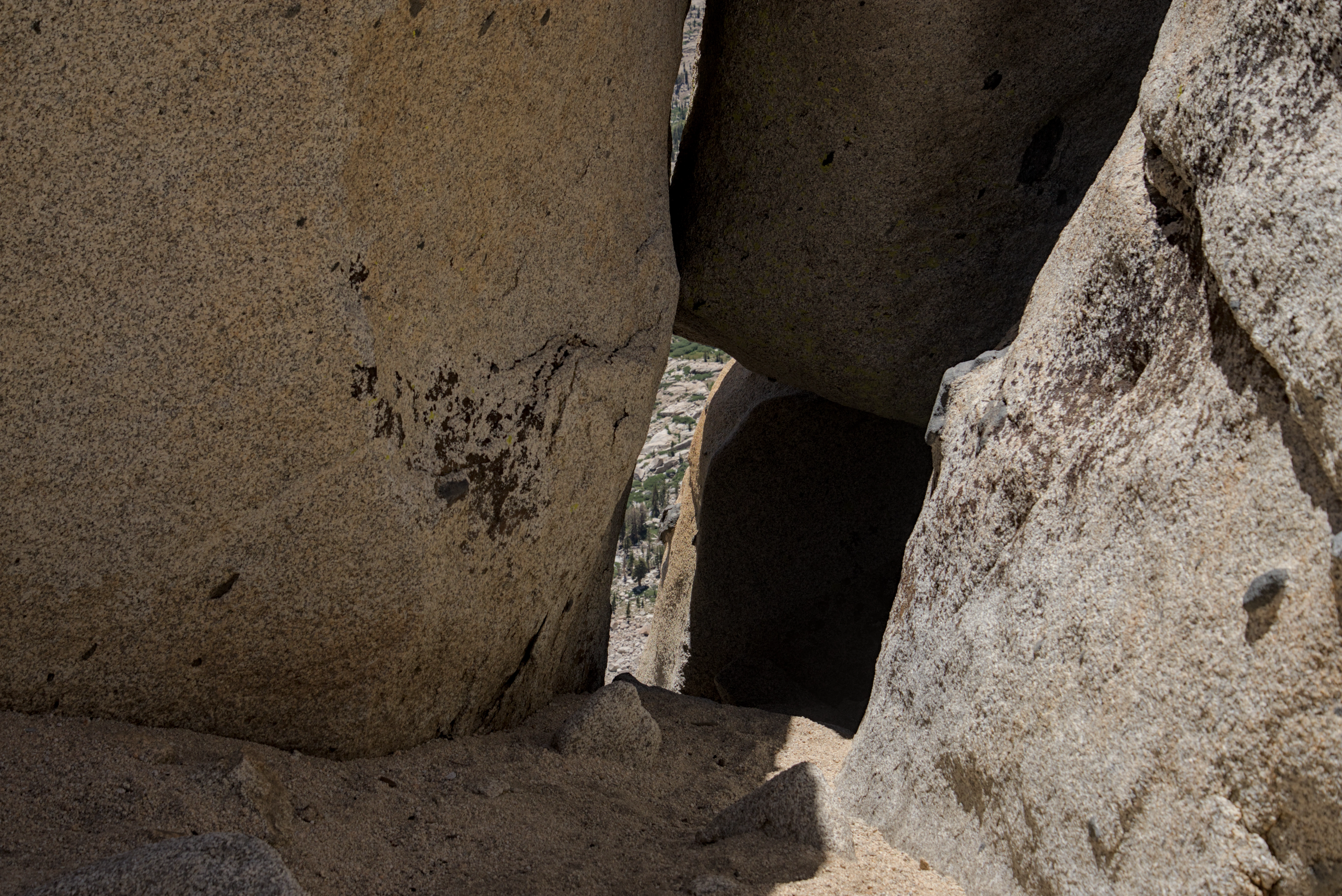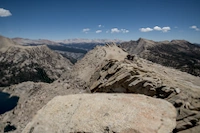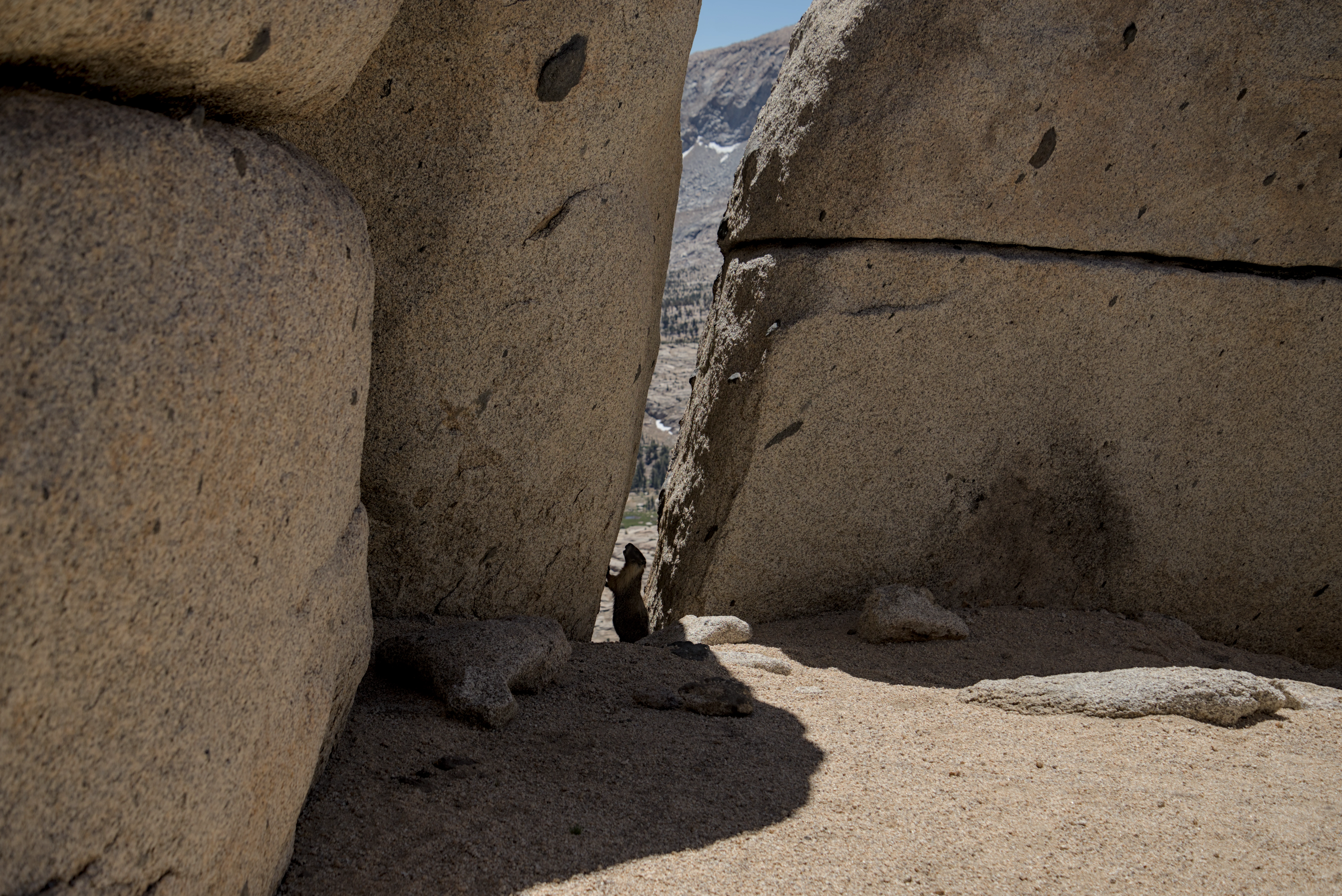 Shortly before reaching Franklin Pass, we reached the ridgeline and were able to see the view to the east. From the vantage point of this photo, much of the remaining hike is visible. Whitney is the large peak in the backgroud, just left of centre. Pacman Lake, where we camped the night before our ascent, is at the foot the cliffs. The valley with Crabtree Meadows stretches from there to the lower left into the Kern River valley, which runs to the right behind the rock outcrop in the centre.