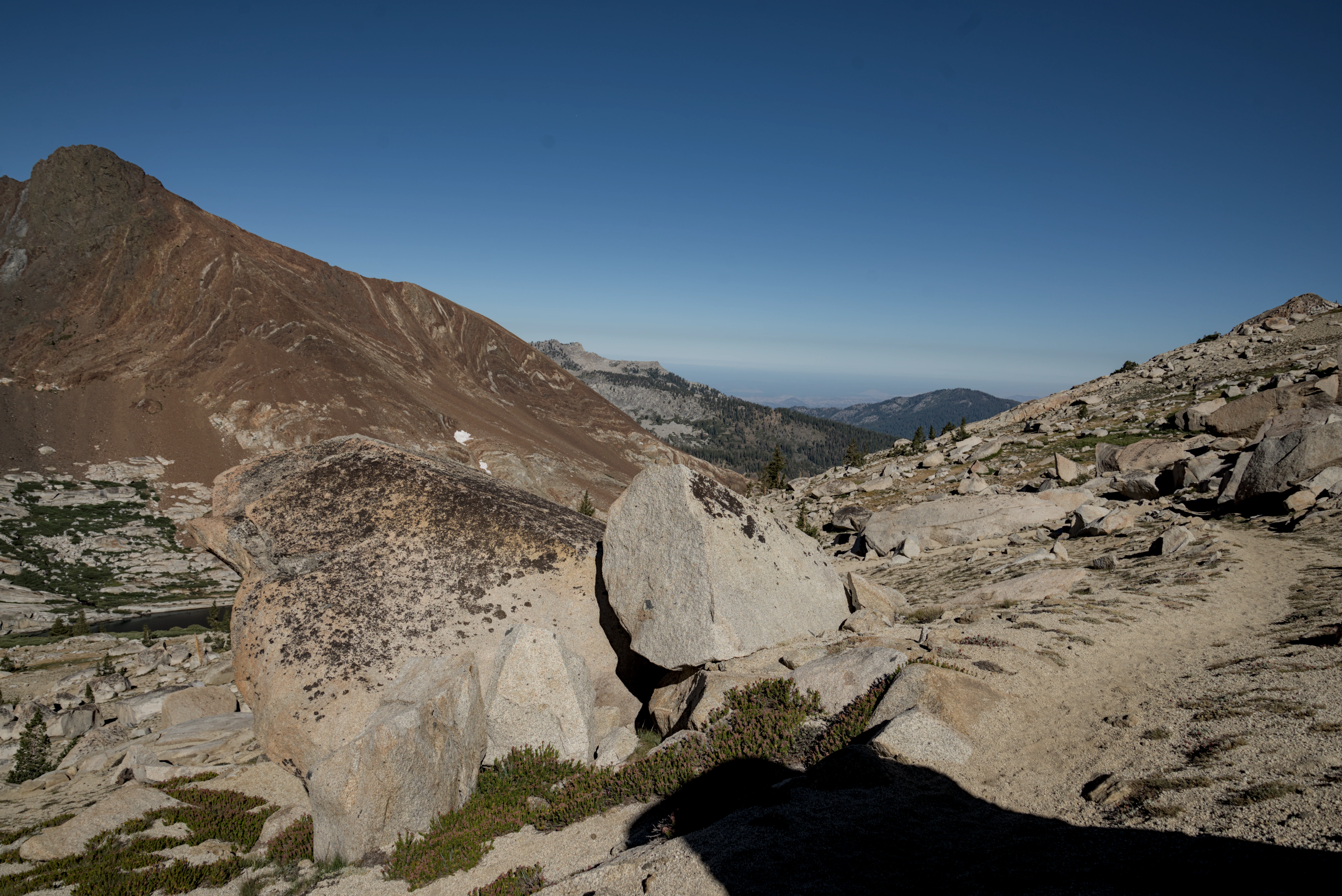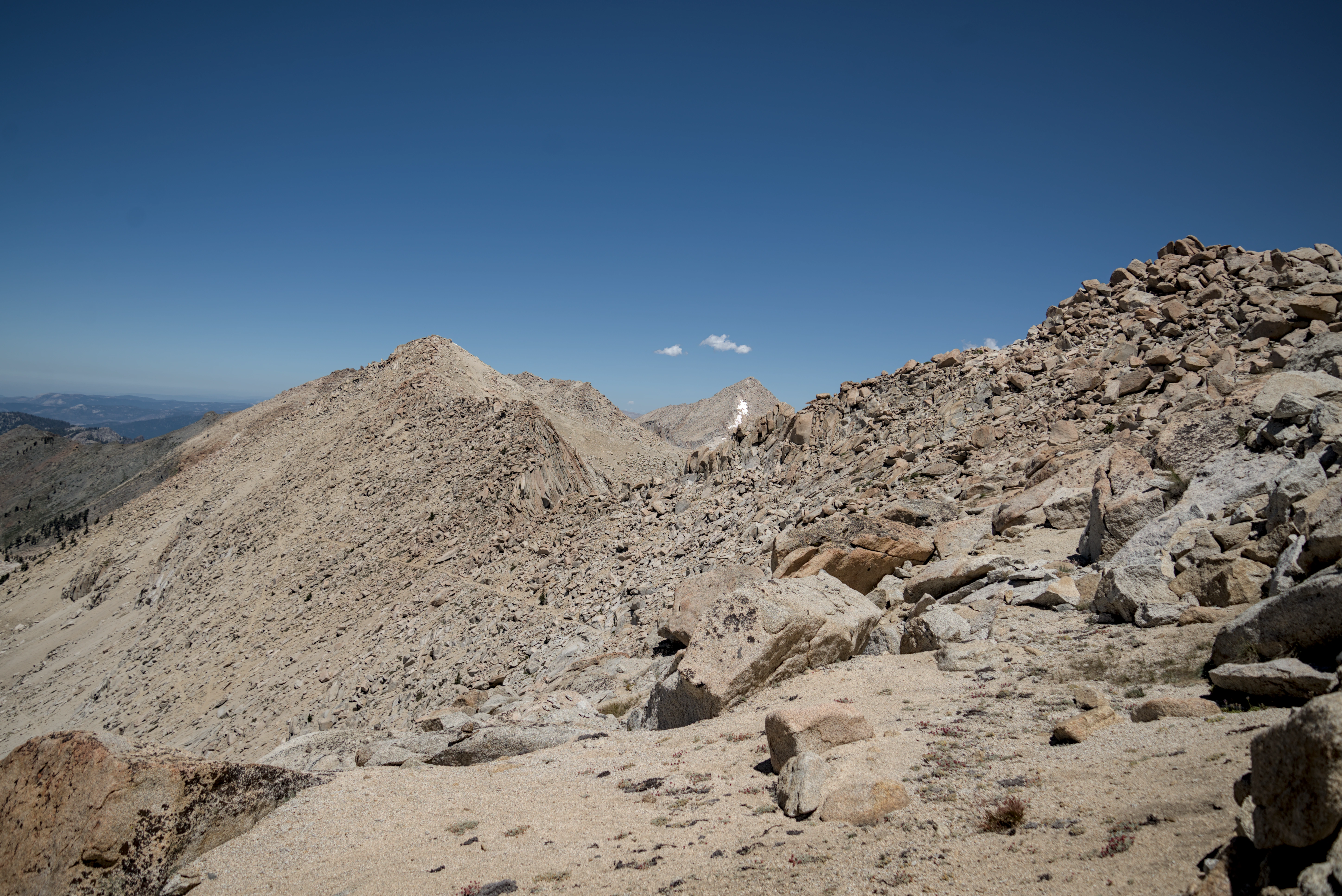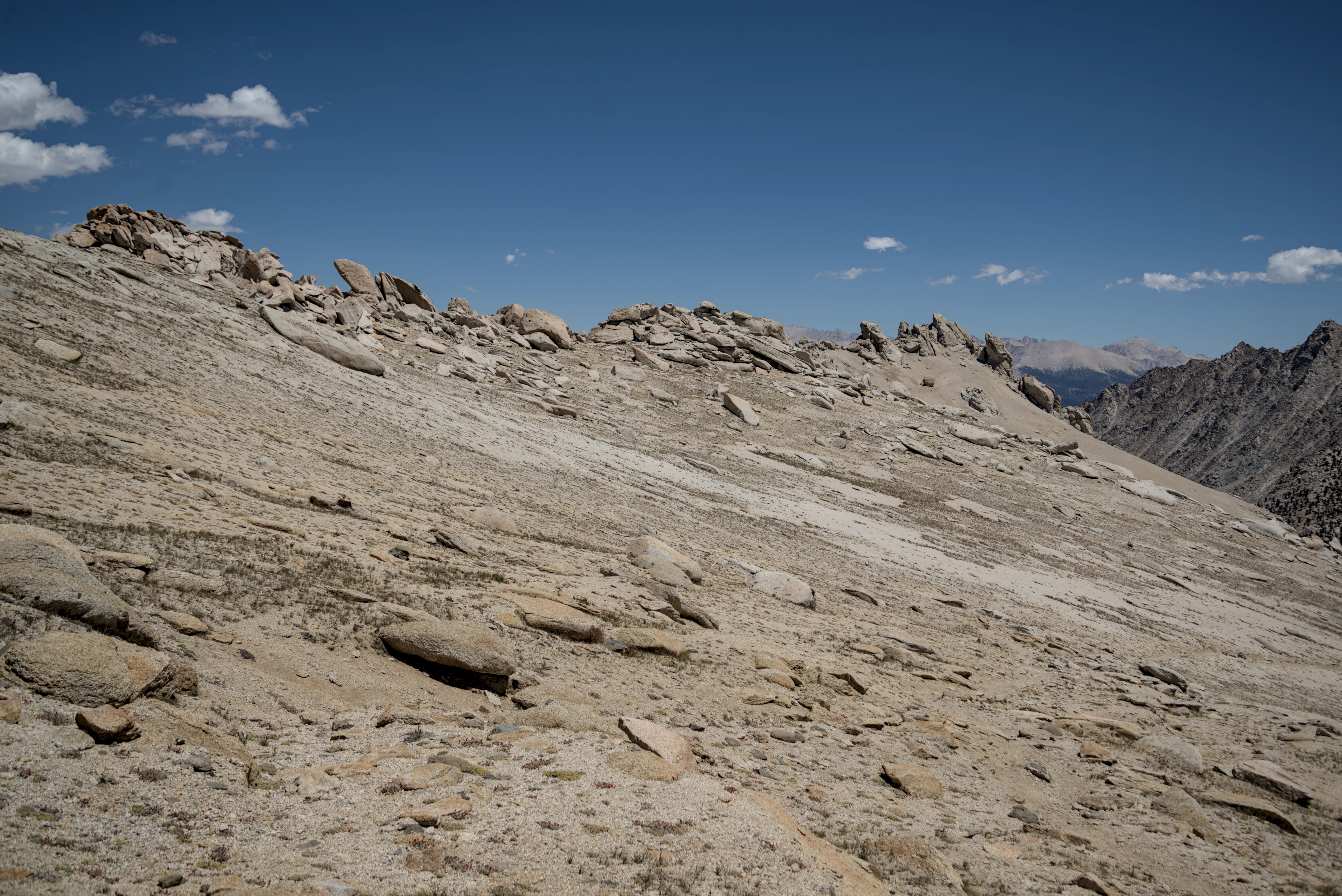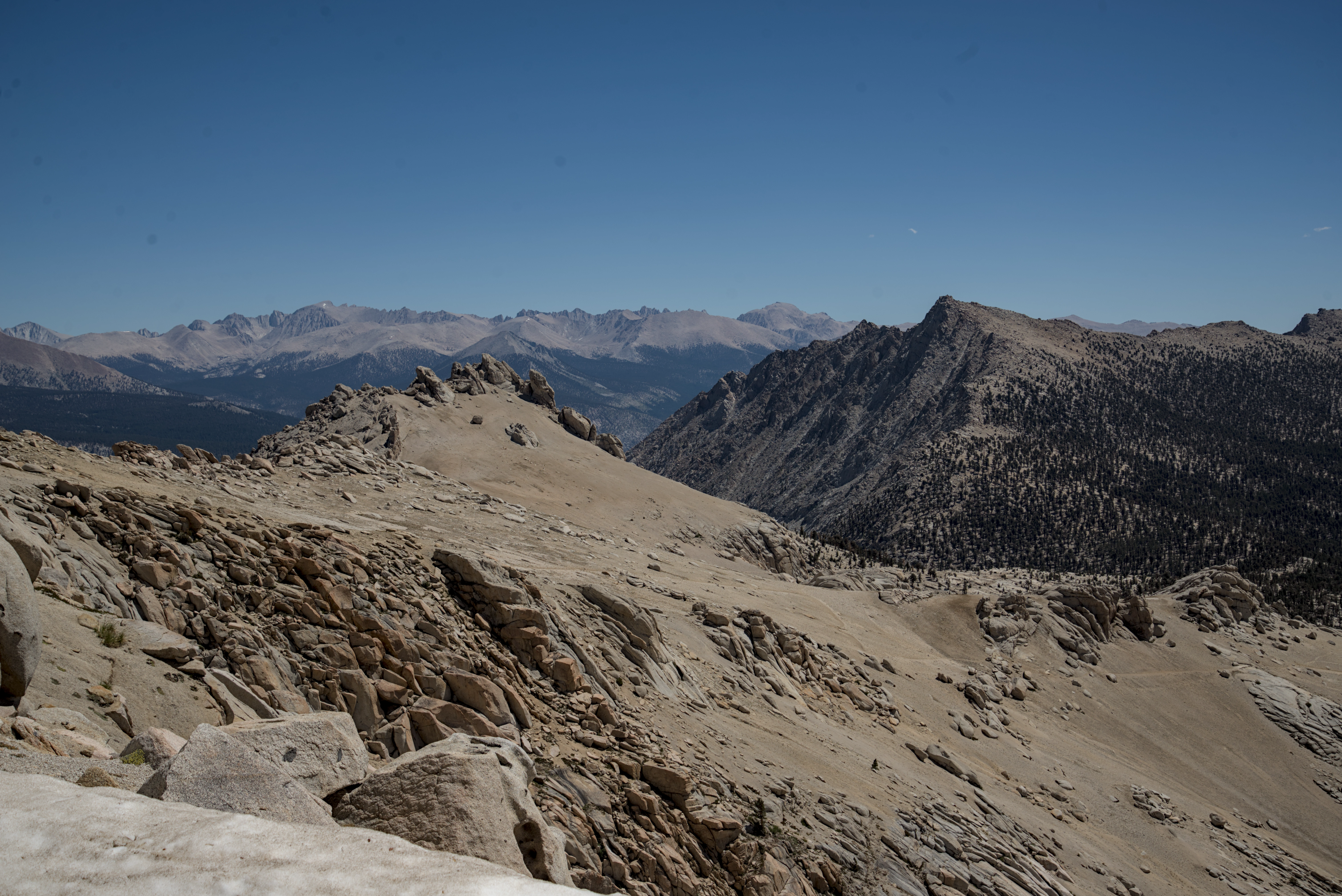 At Franklin Pass, the rocky ridge we were hiking along hits a long sandy ridge that the trail switchbacks down into the valley far below.