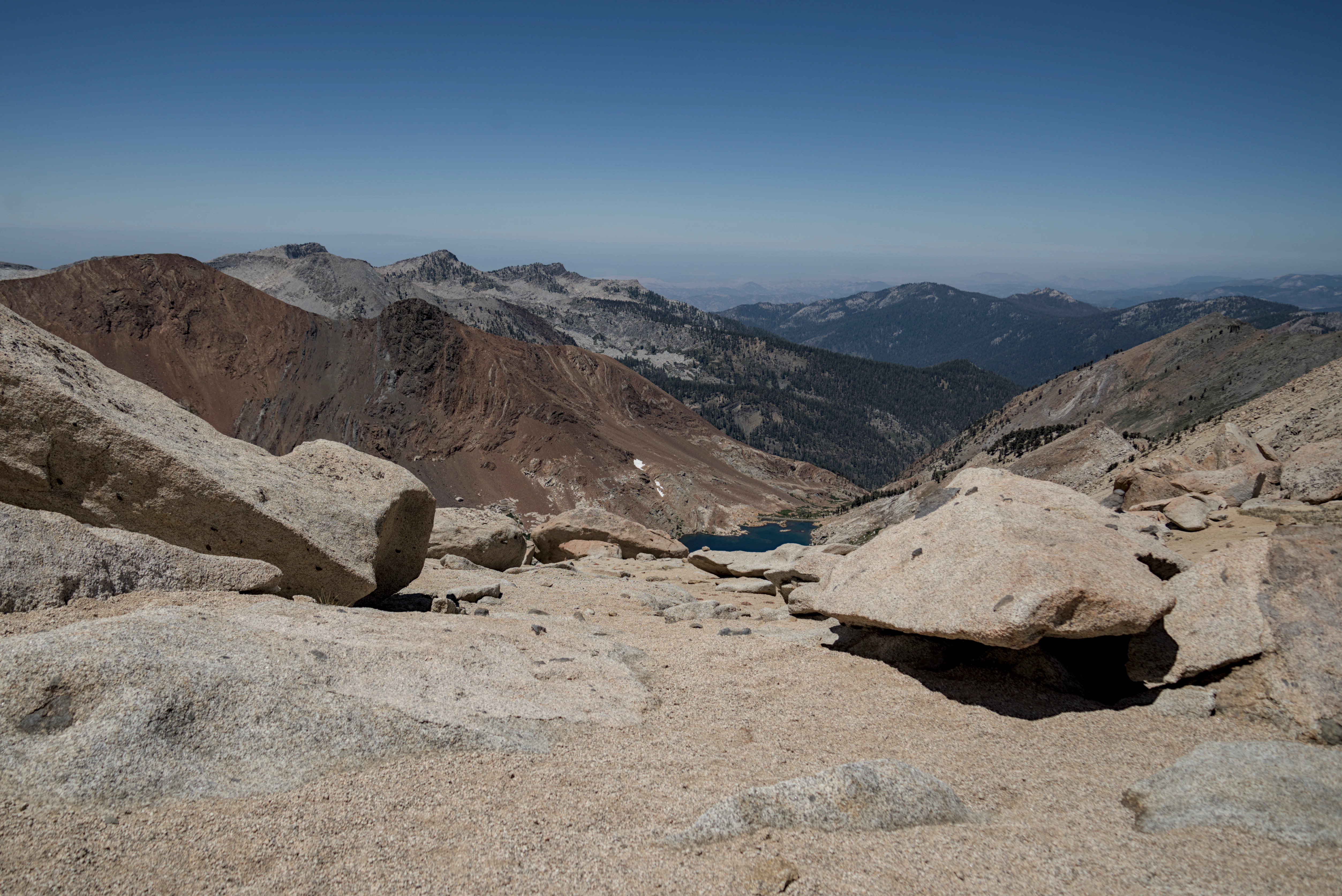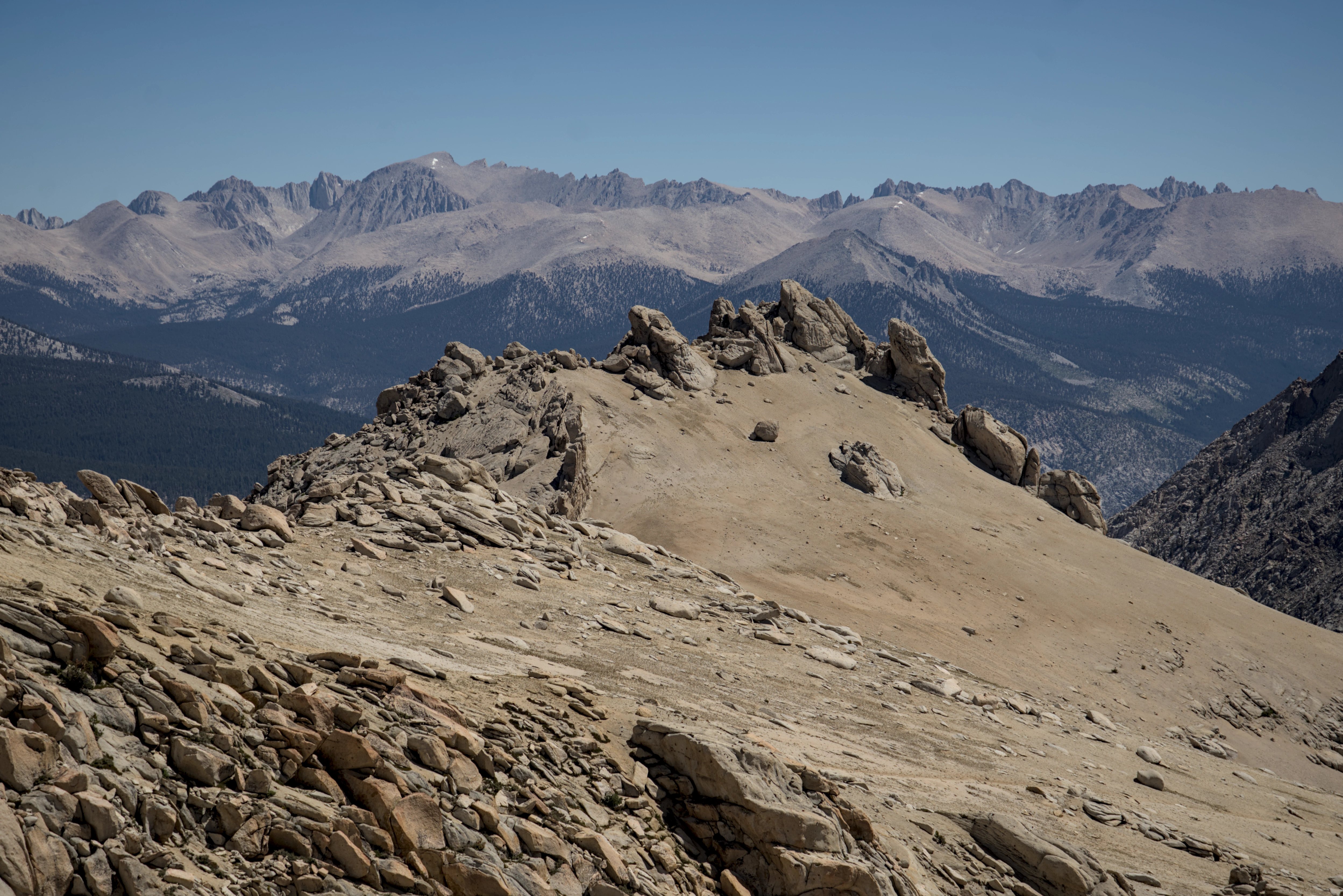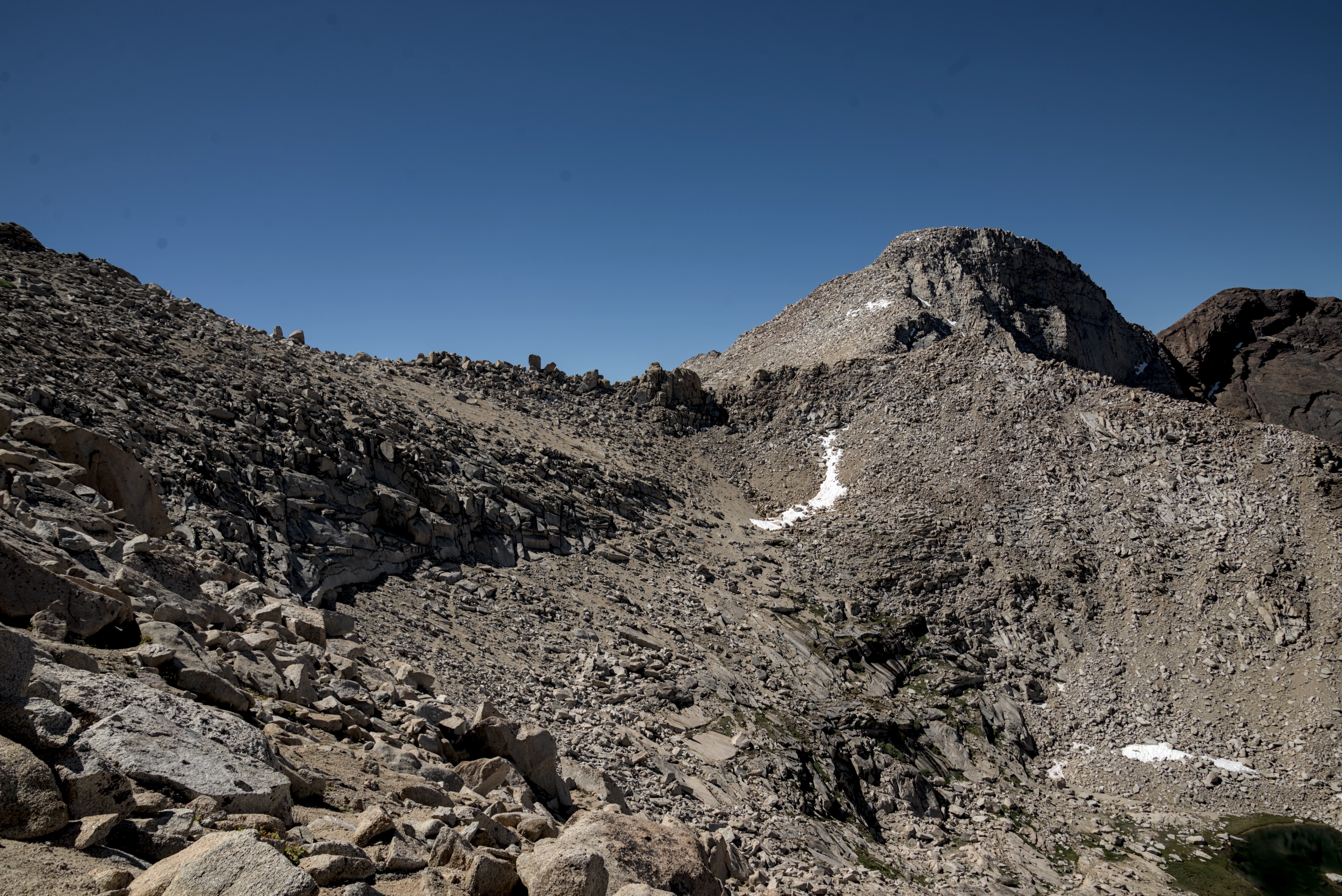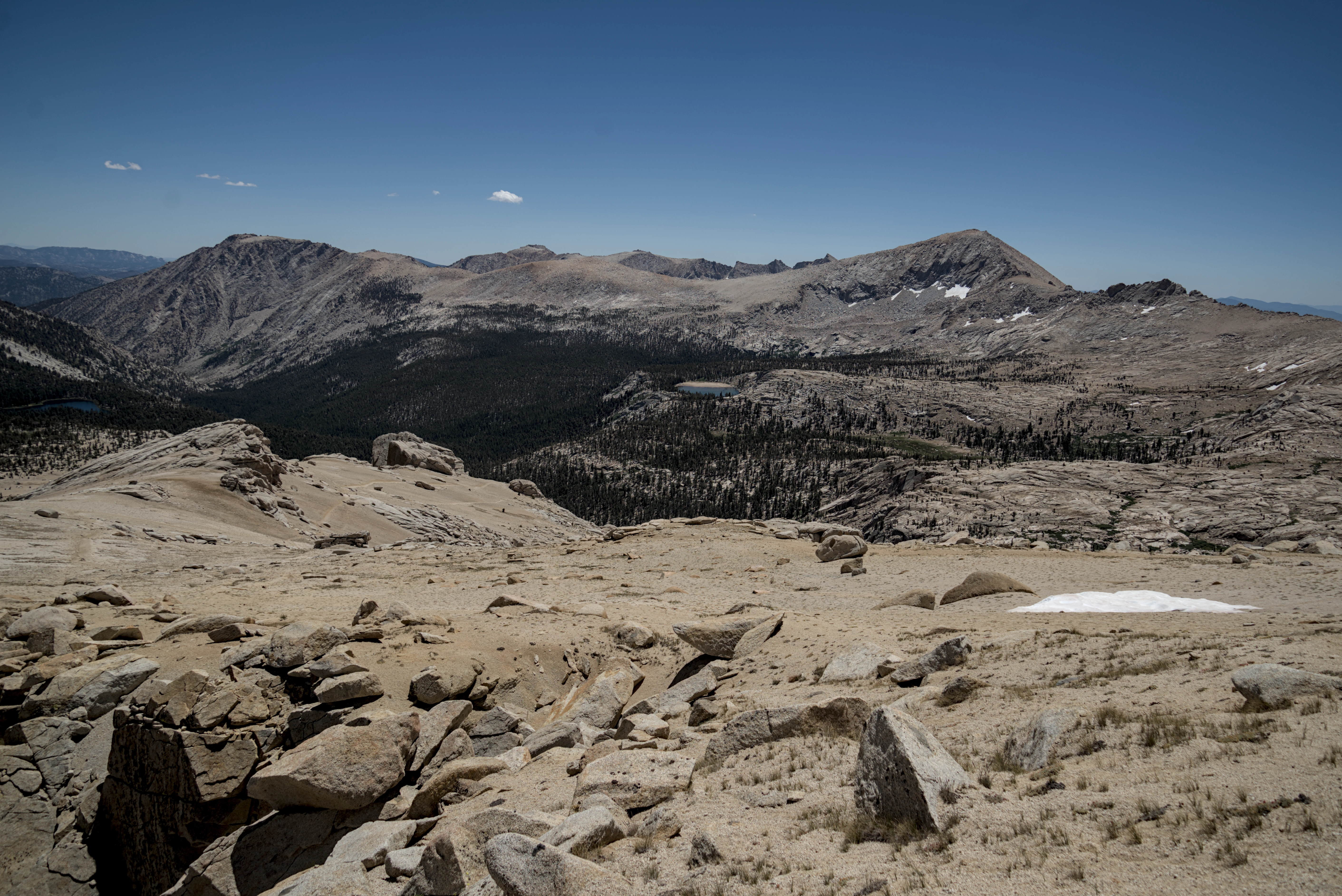 At Franklin Pass, the rocky ridge we were hiking along hits a long sandy ridge that the trail switchbacks down into the valley far below.