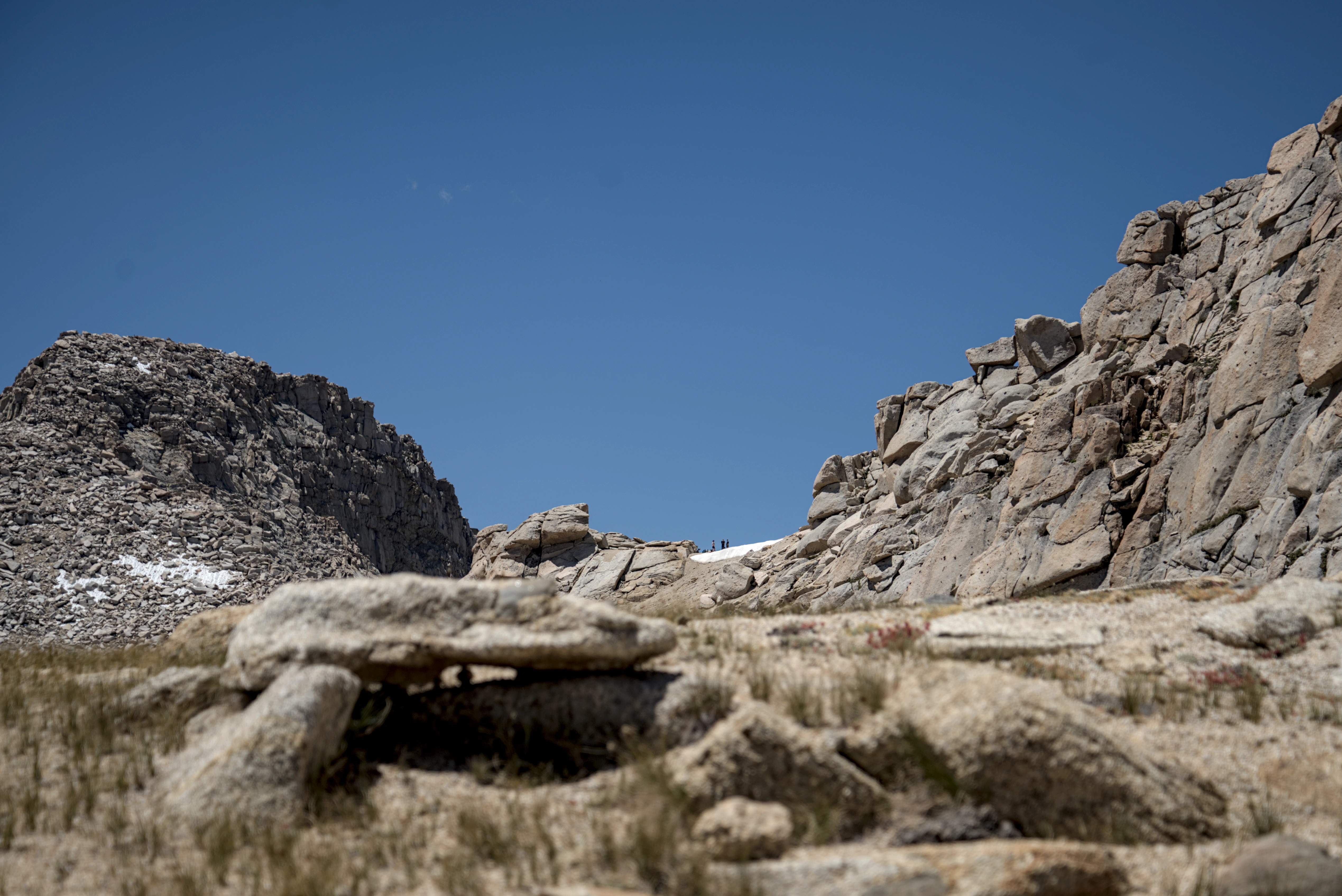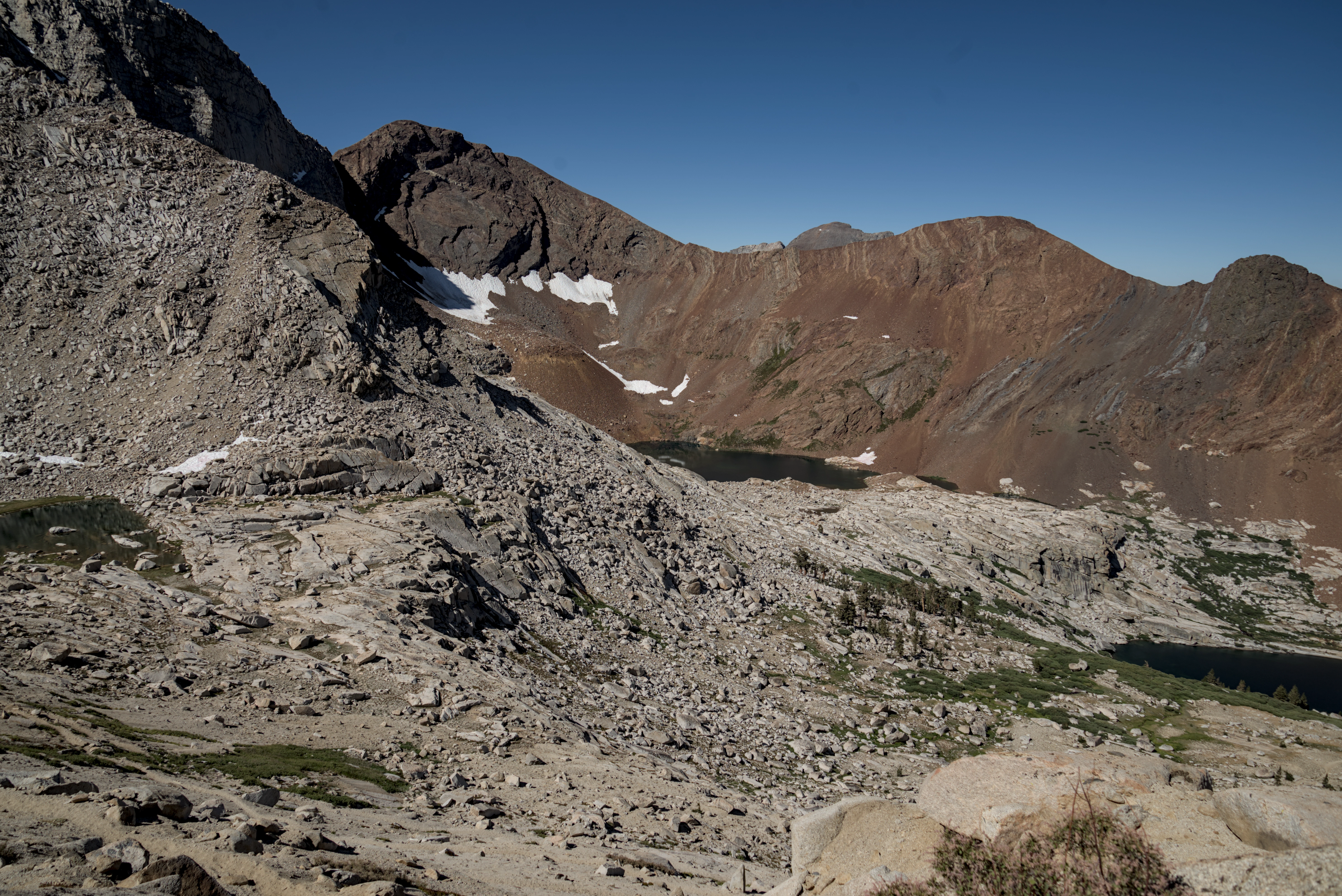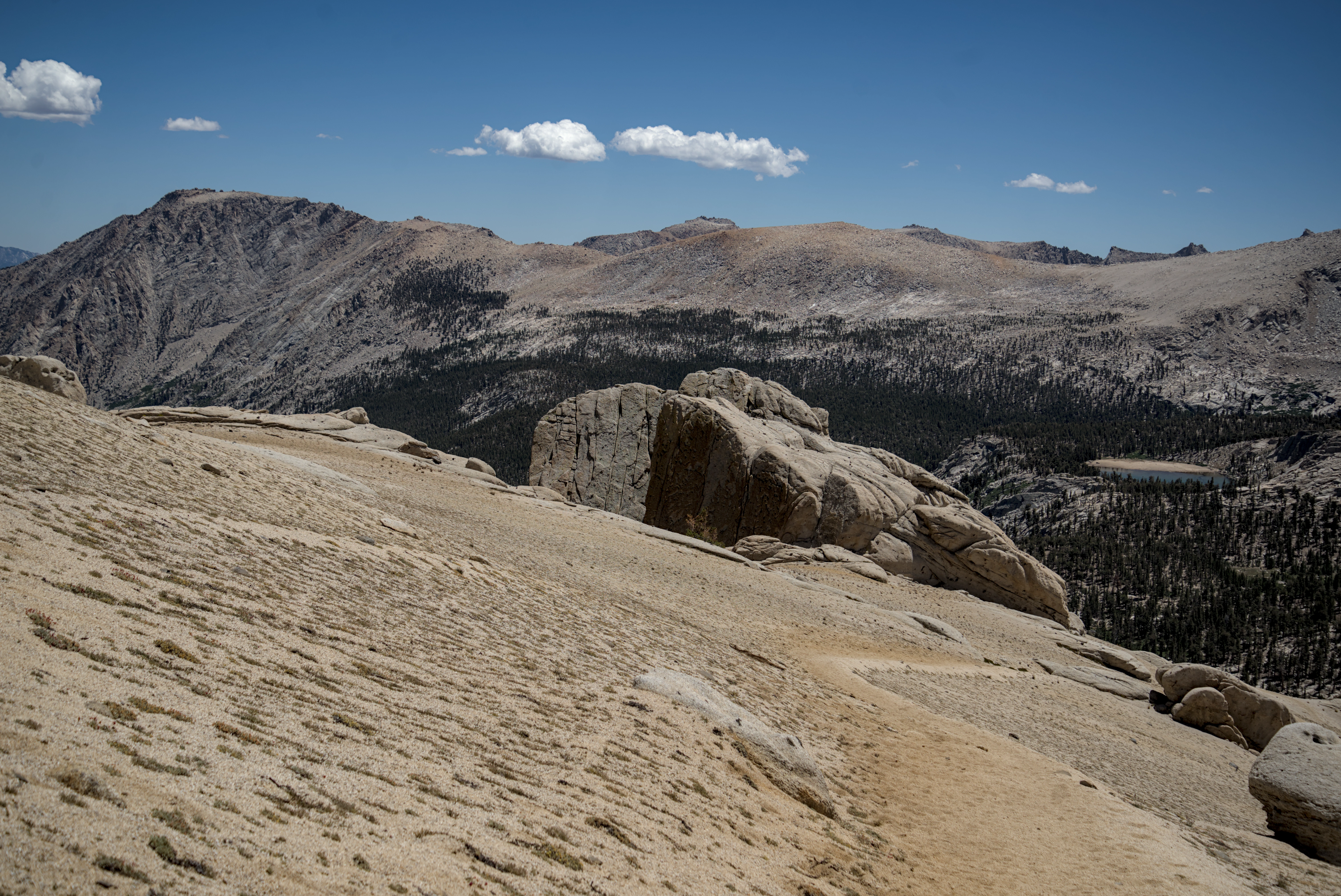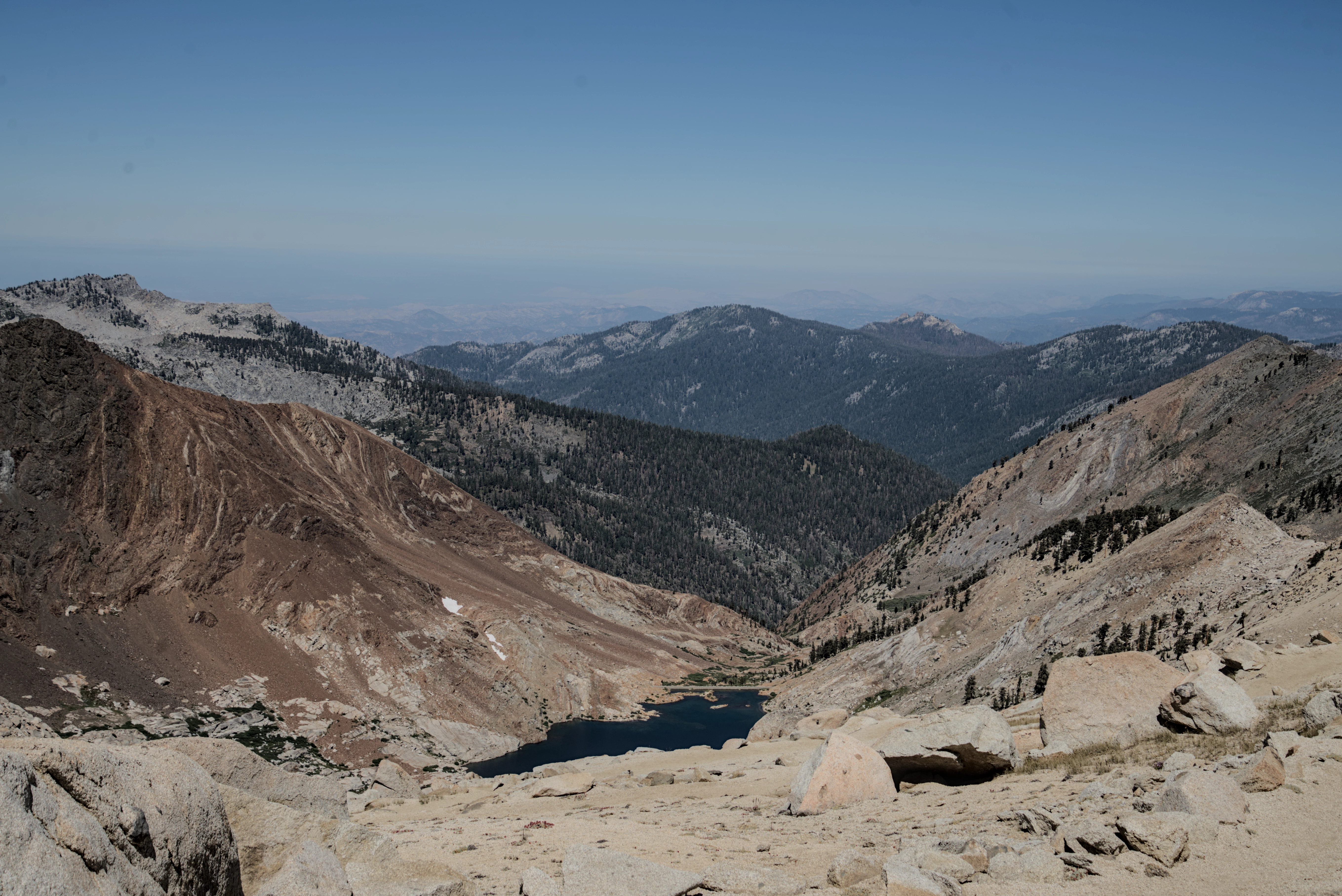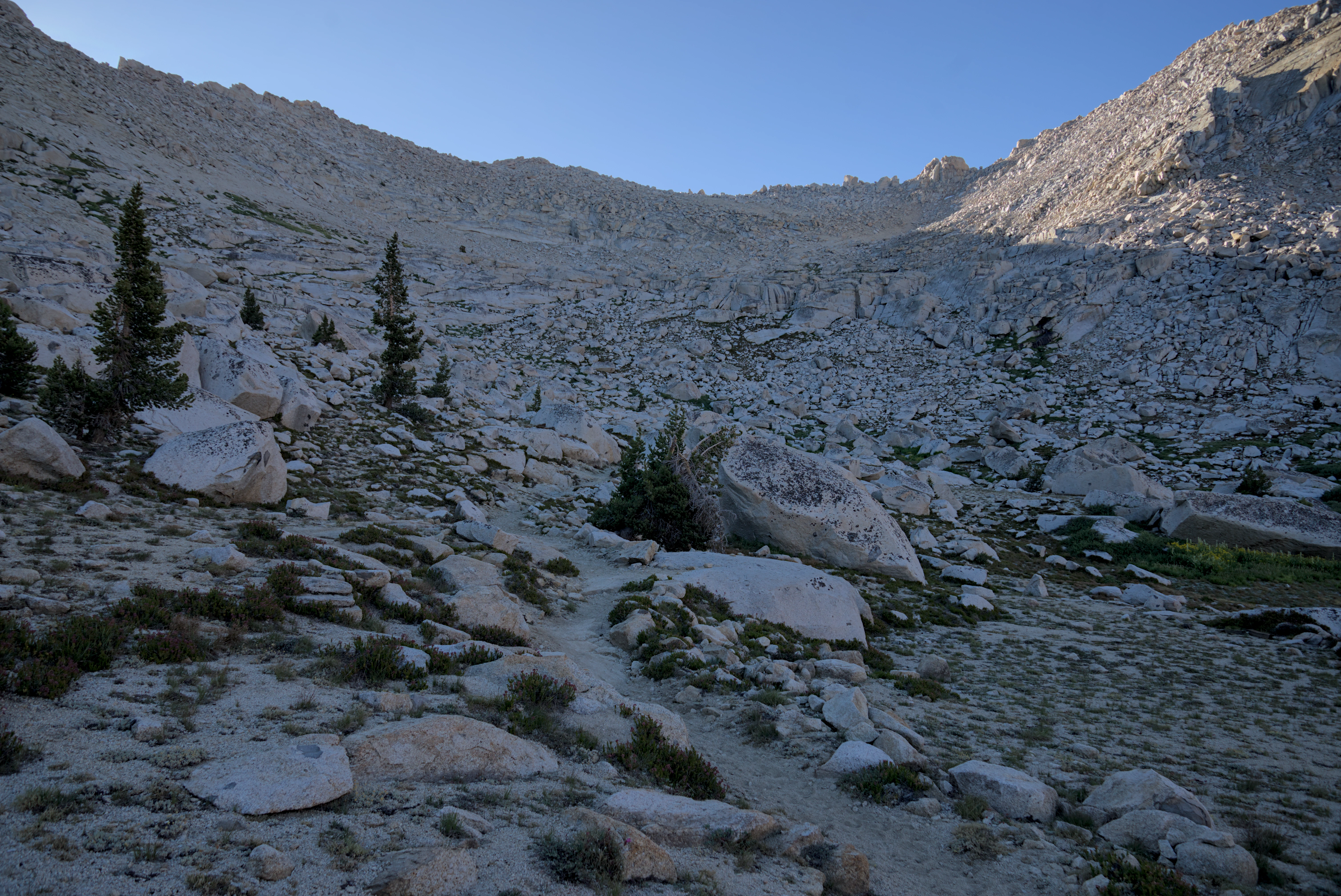 At Franklin Pass, the rocky ridge we were hiking along hits a long sandy ridge that the trail switchbacks down into the valley far below.