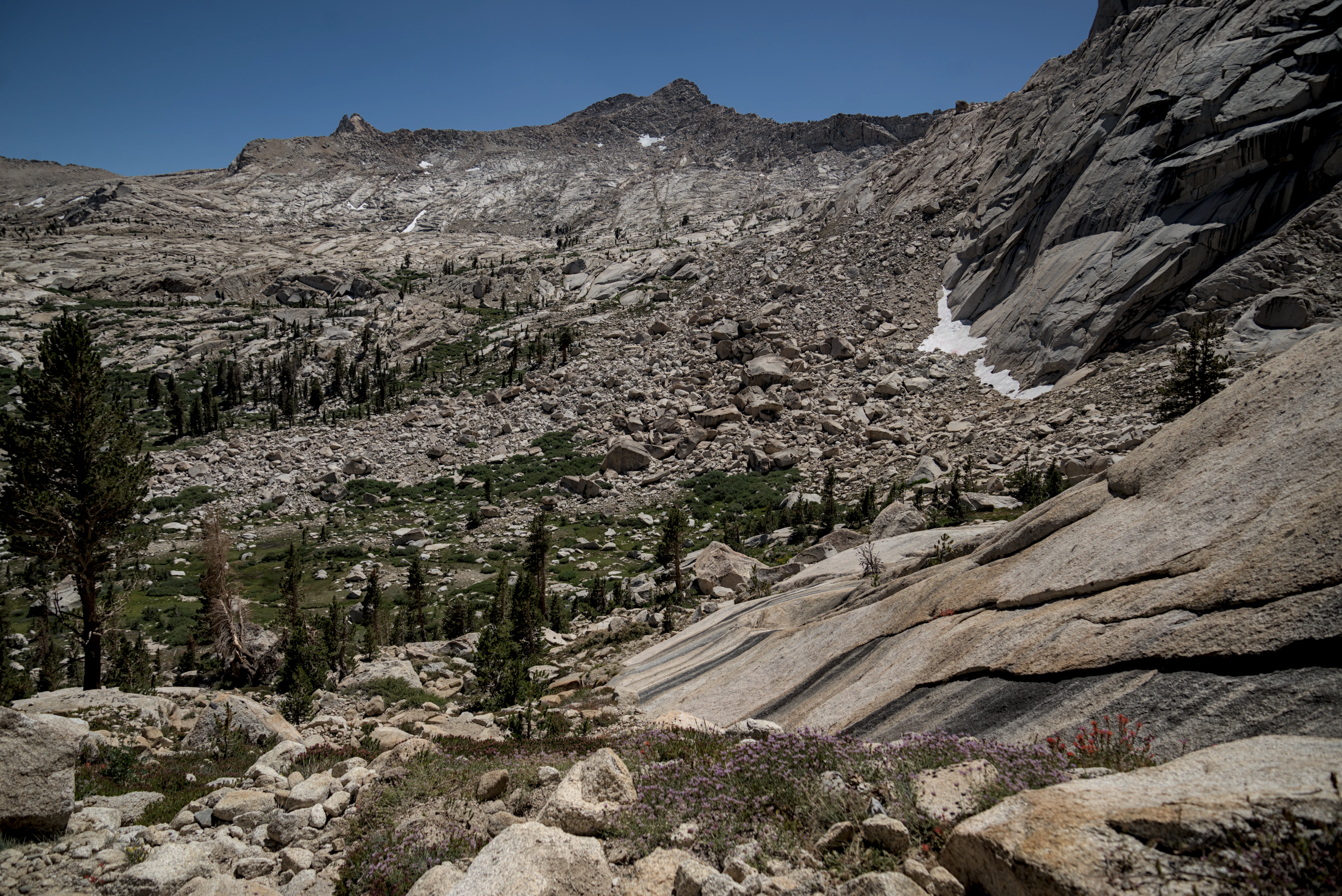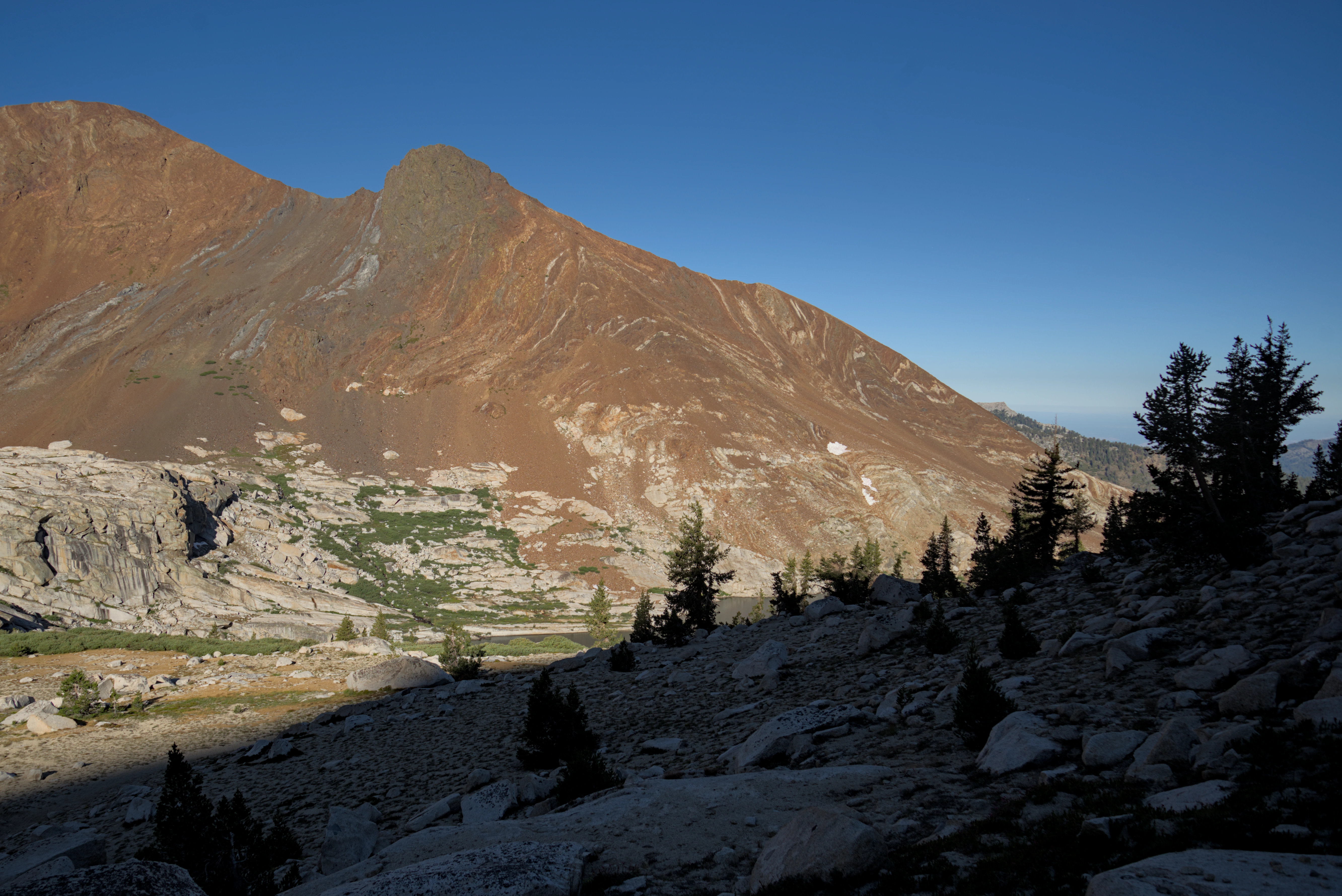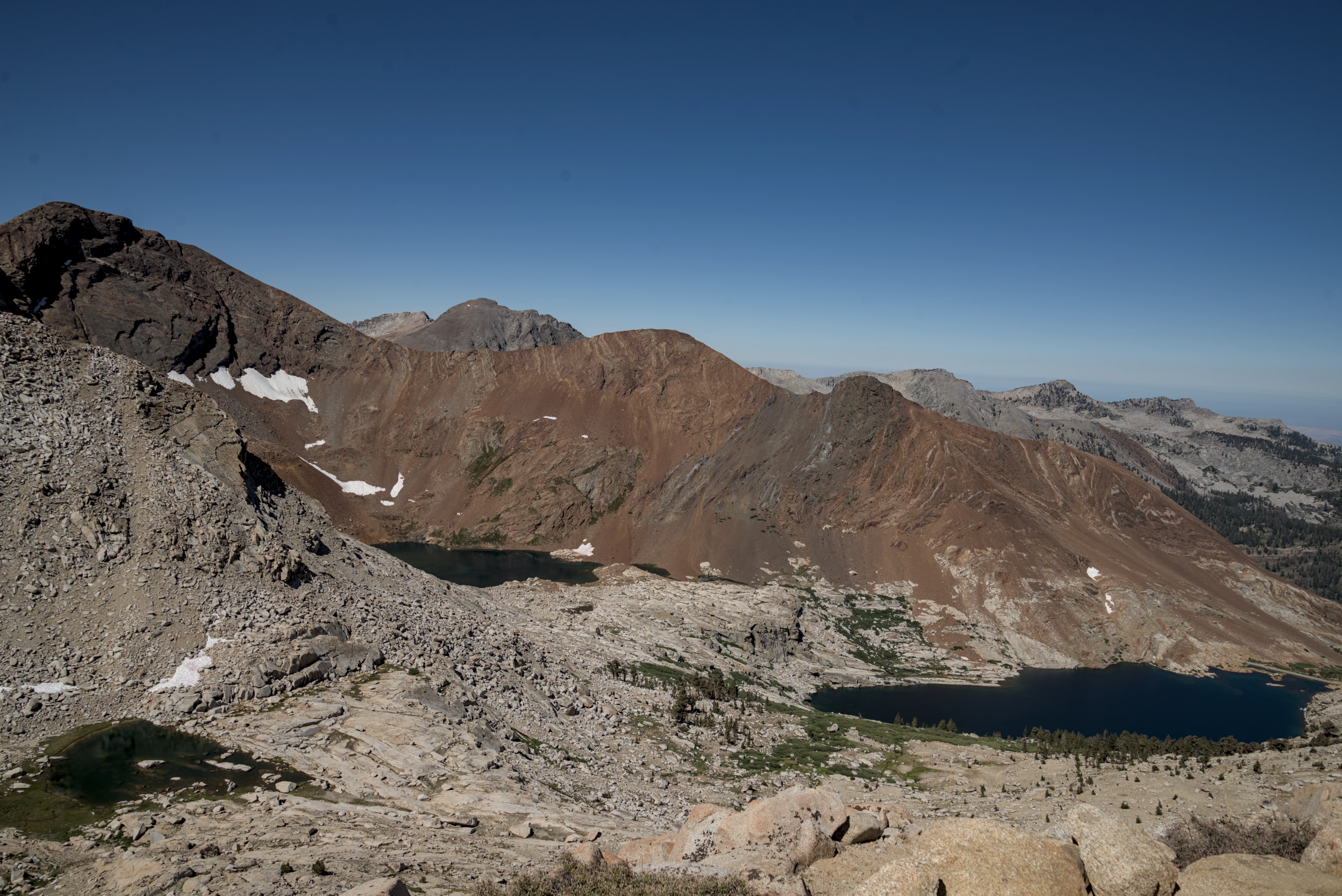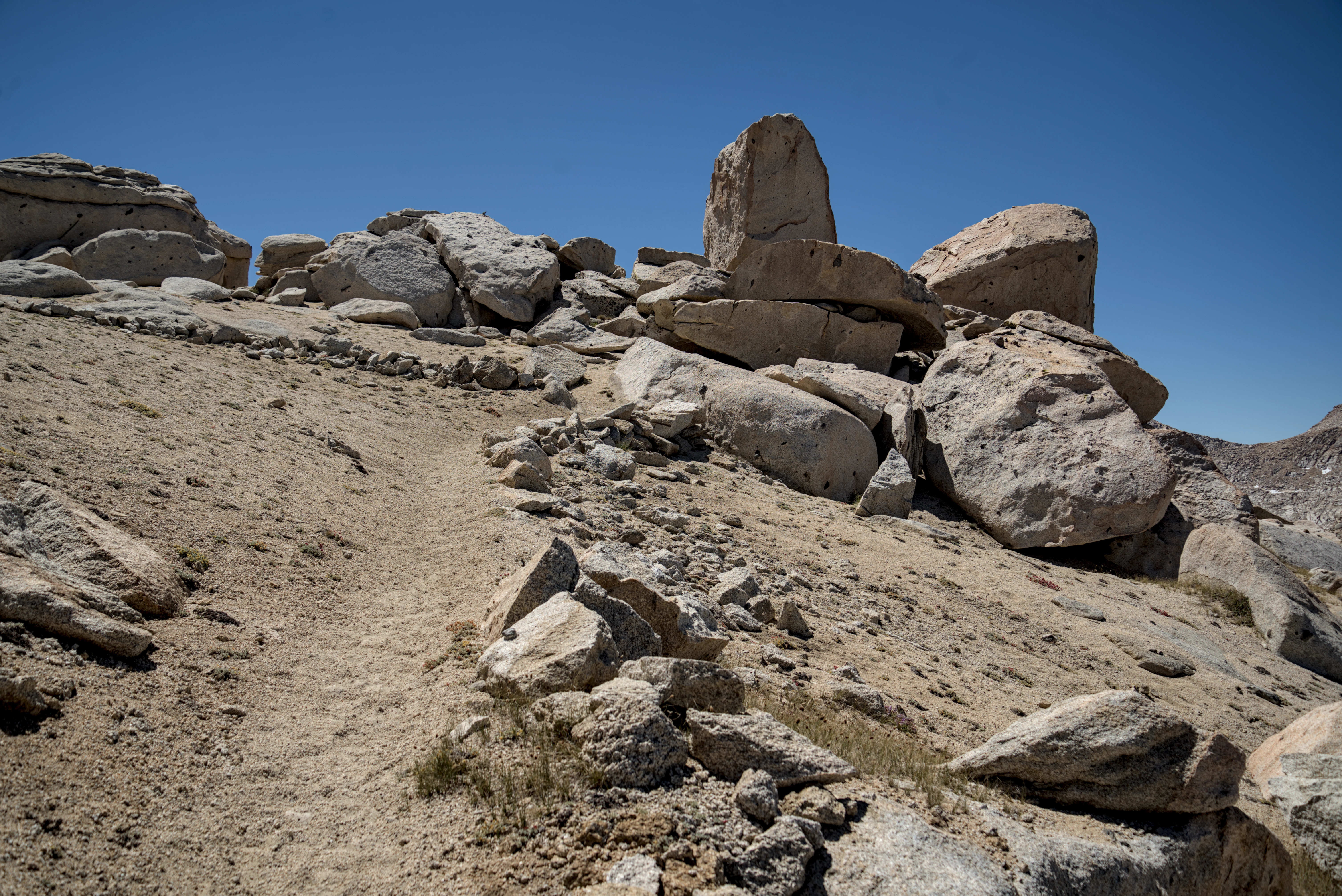 At Franklin Pass, the rocky ridge we were hiking along hits a long sandy ridge that the trail switchbacks down into the valley far below.