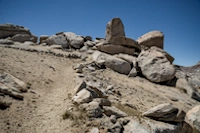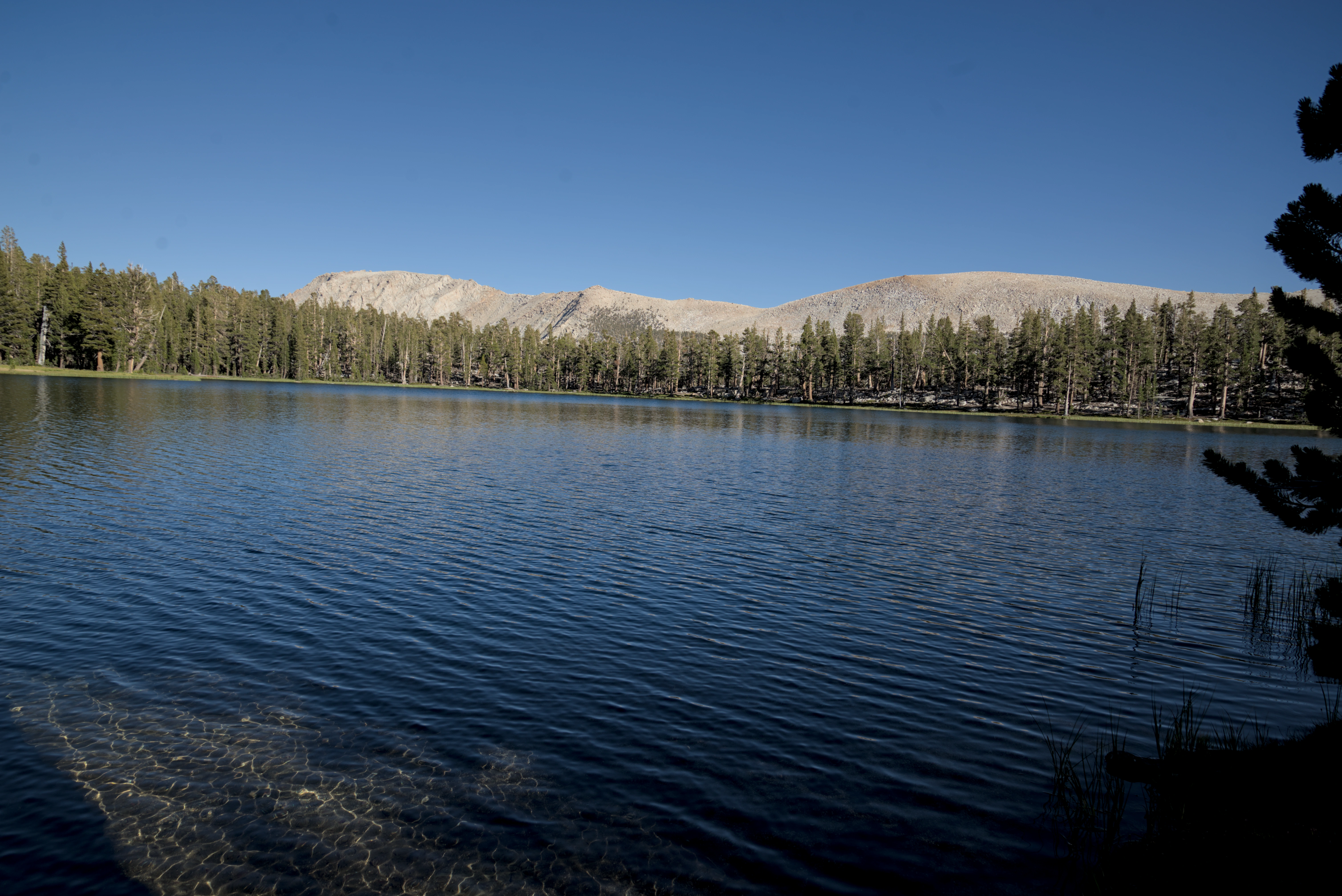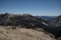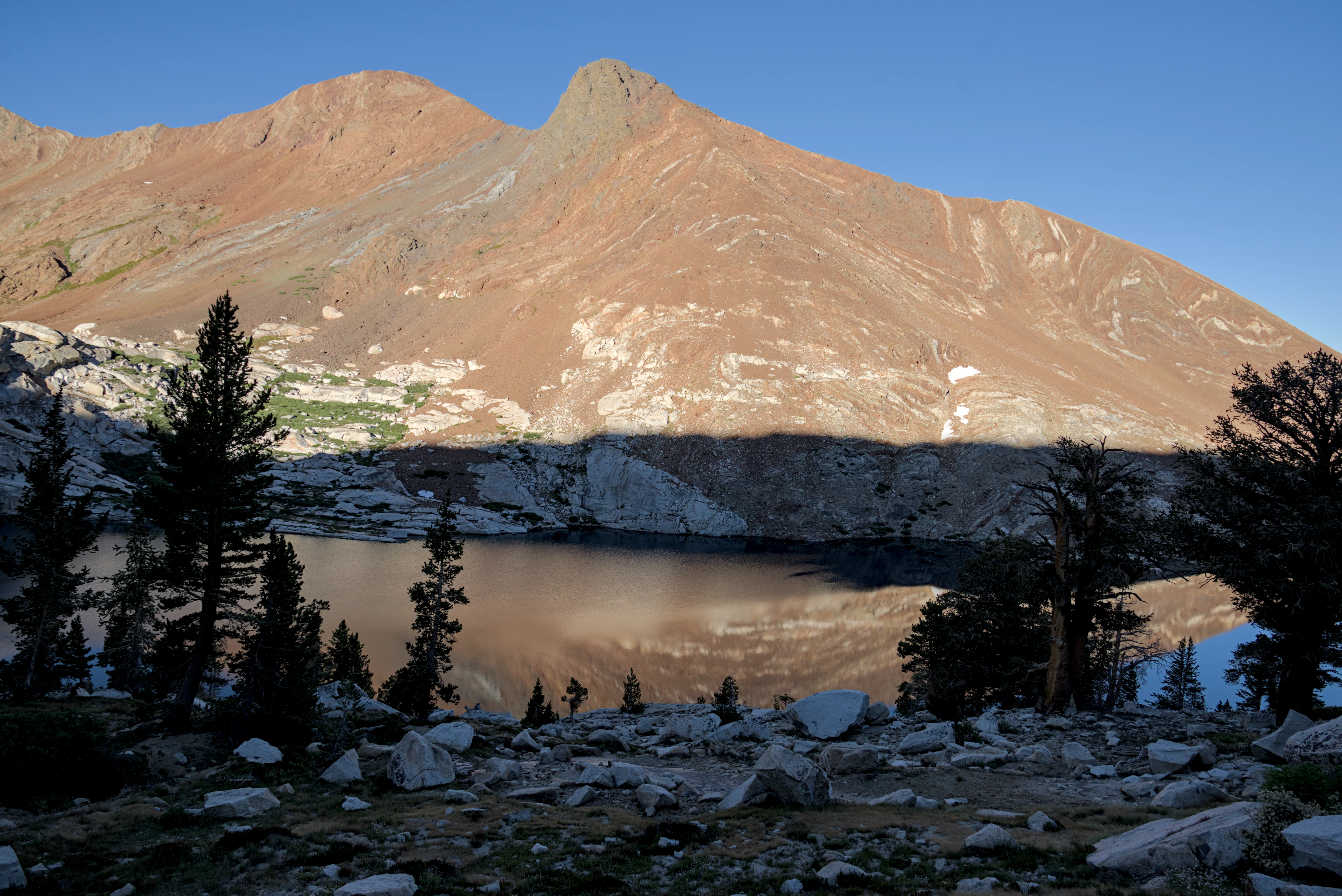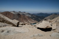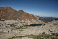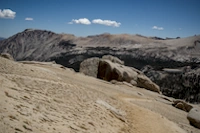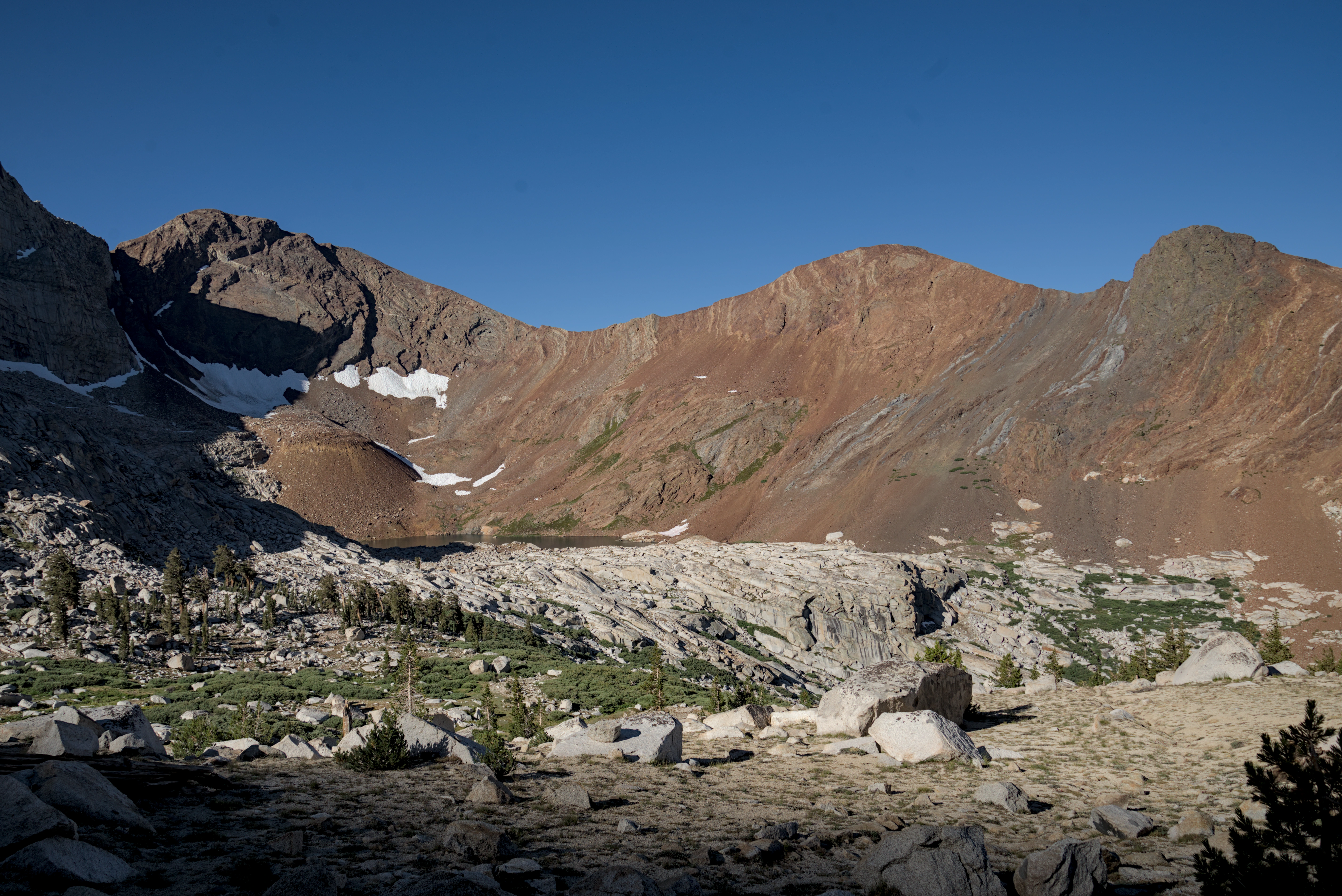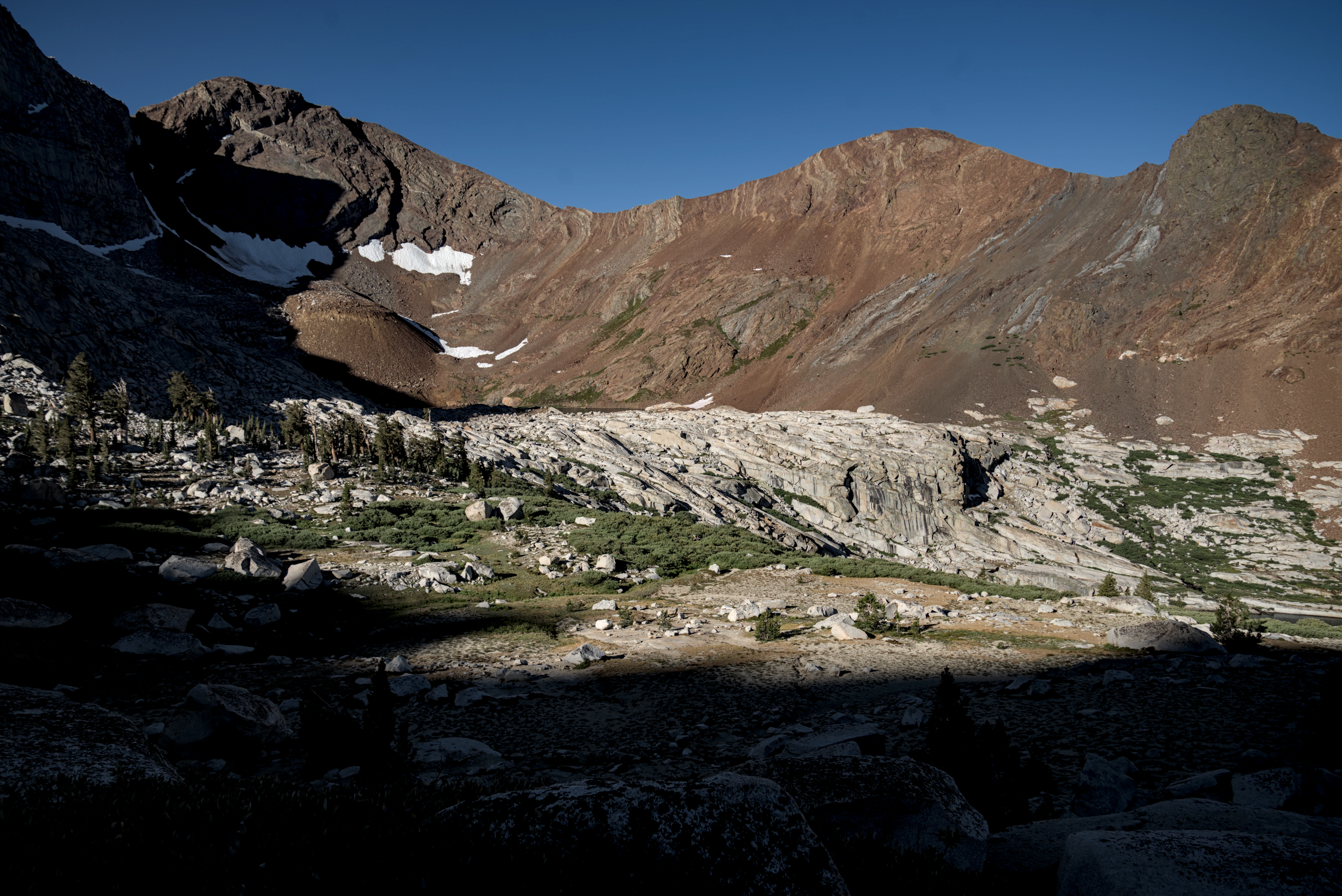 At Franklin Pass, the rocky ridge we were hiking along hits a long sandy ridge that the trail switchbacks down into the valley far below.