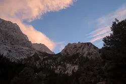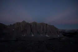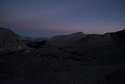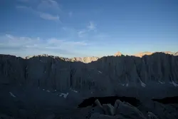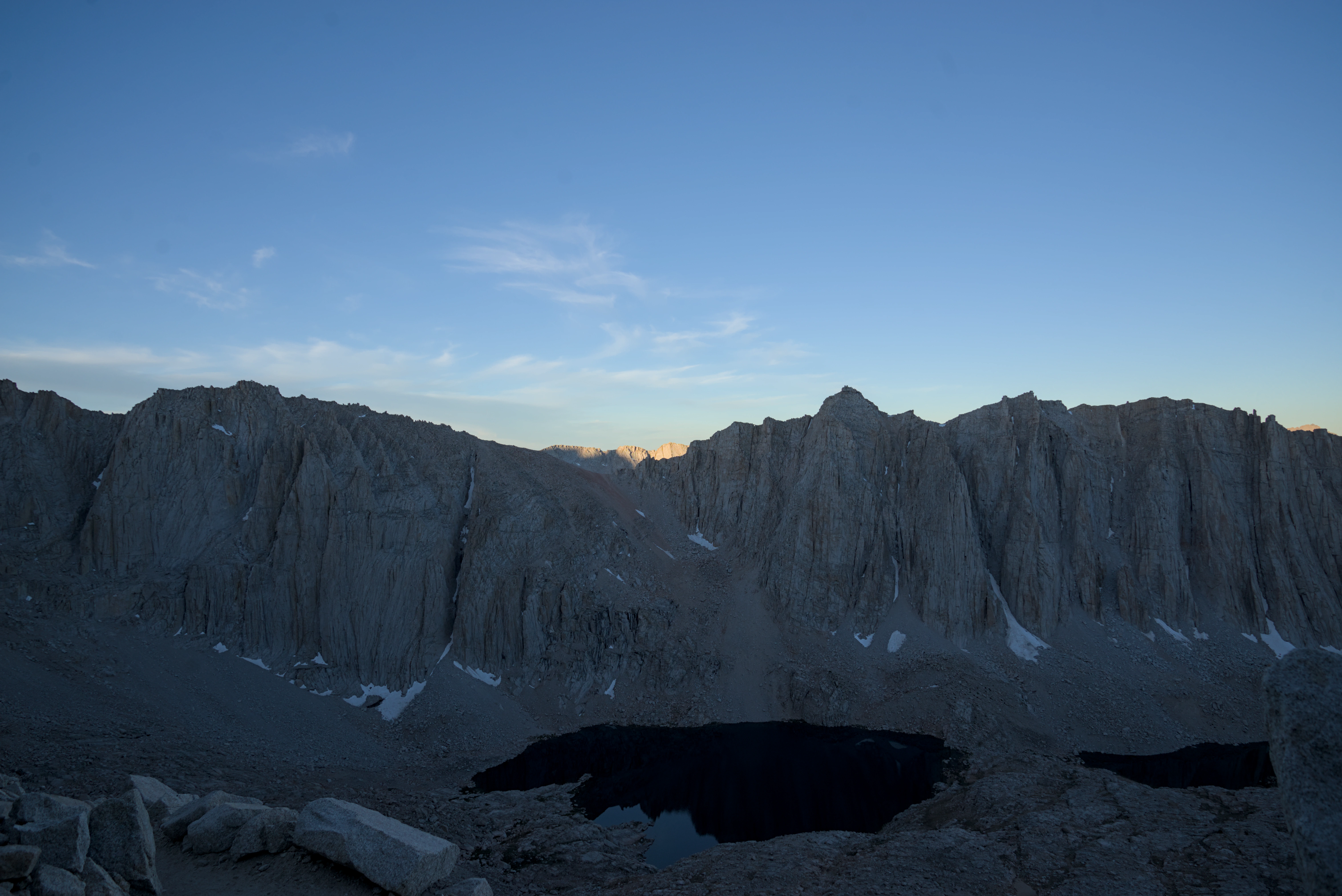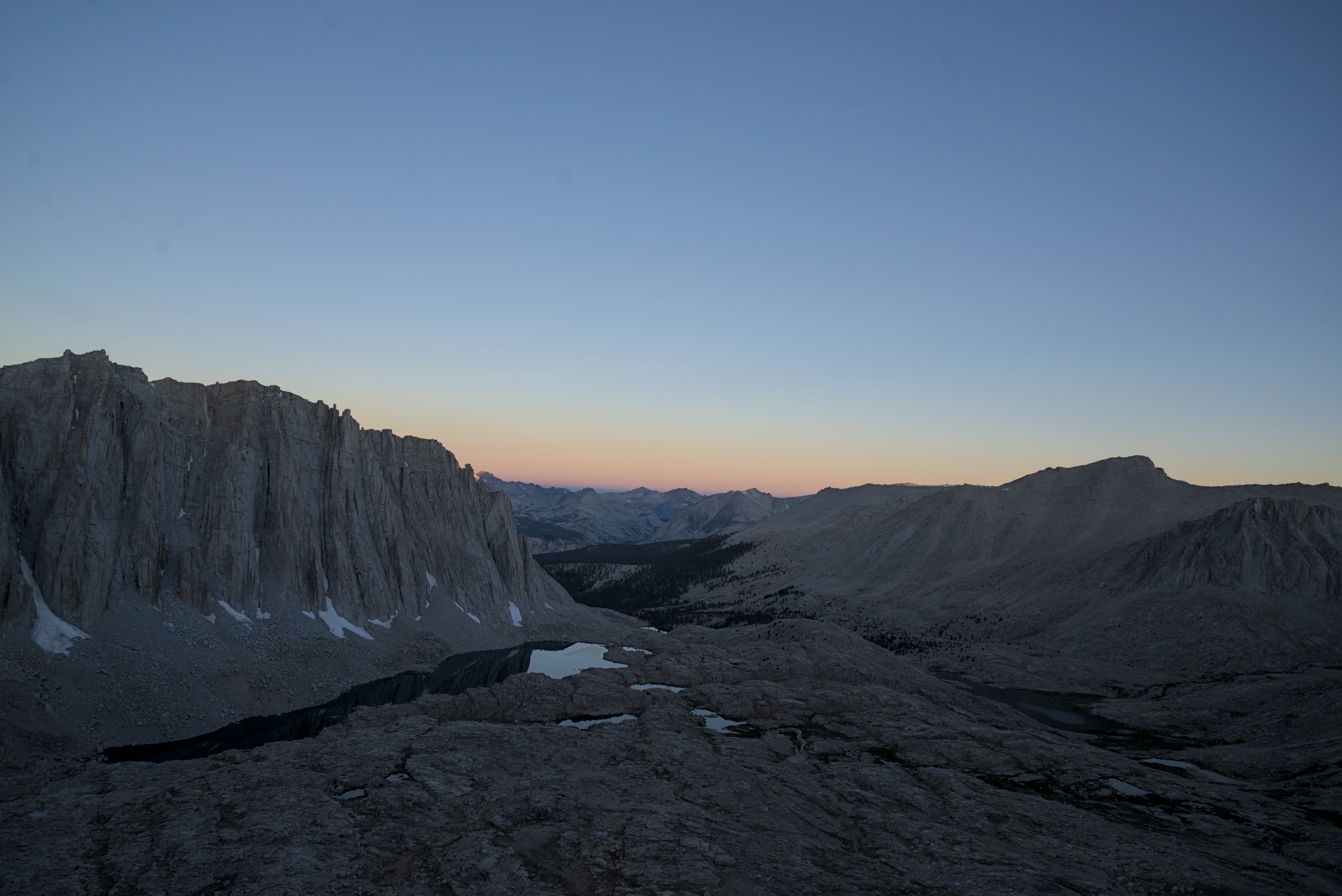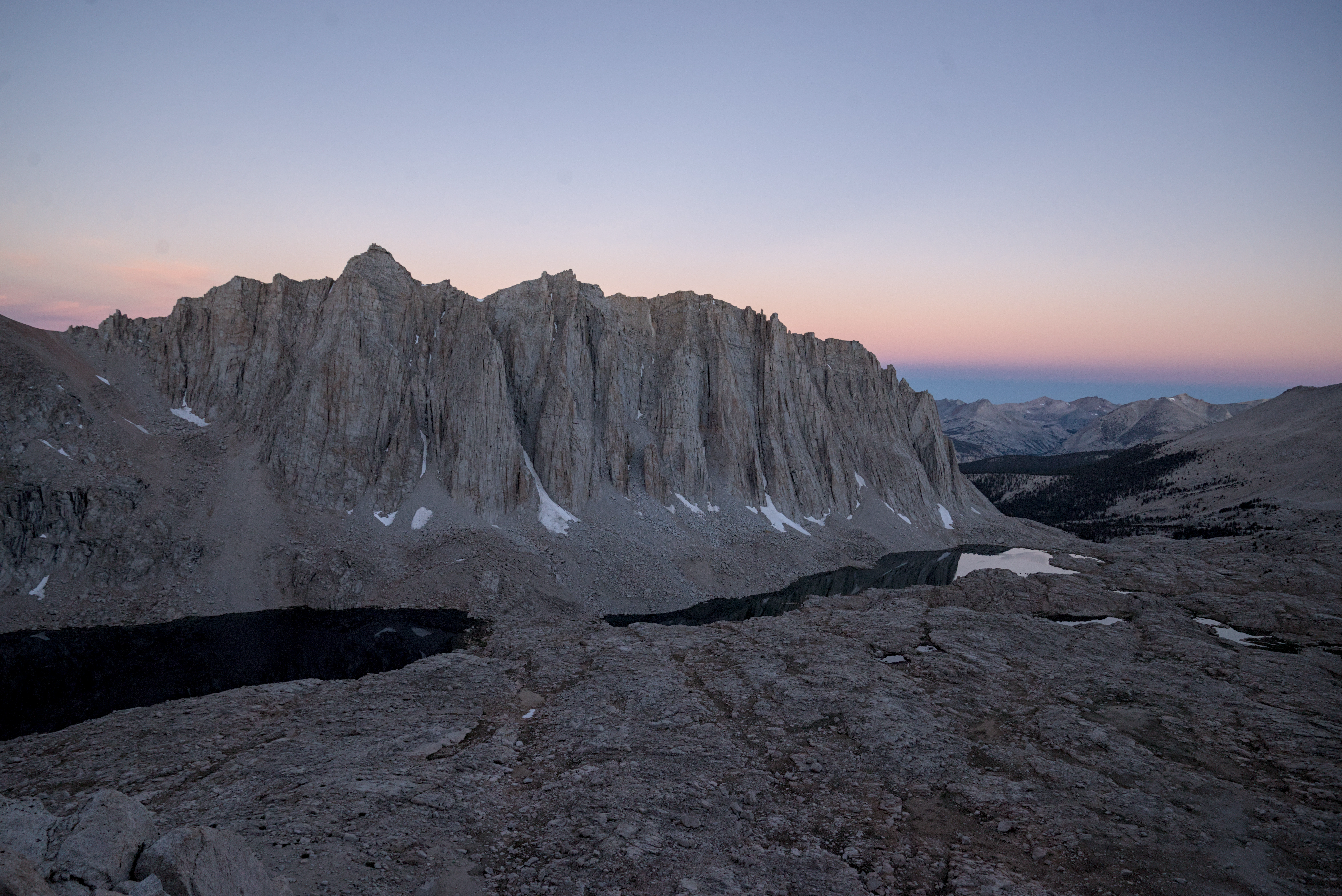 In the mountains, sunrise time varies a lot depending on where you are. There is a little spot of sunlight on knob at the top the cliffs facing guitar lake, even though that knob is tiny compared to everything around it. It must be peeking in from between one of those windows you pass between trail crest and Whitney's summit.