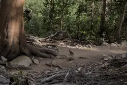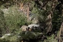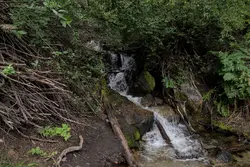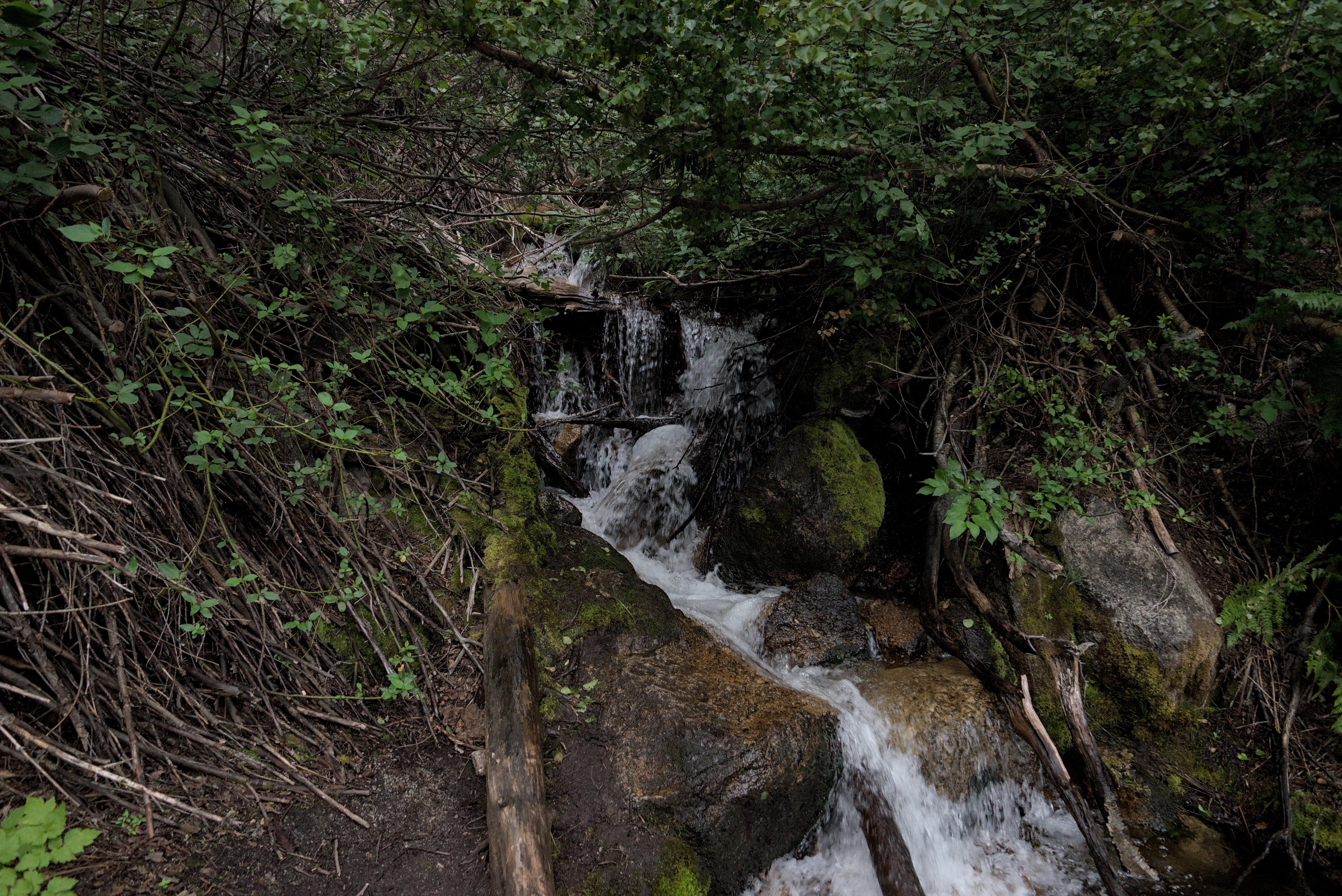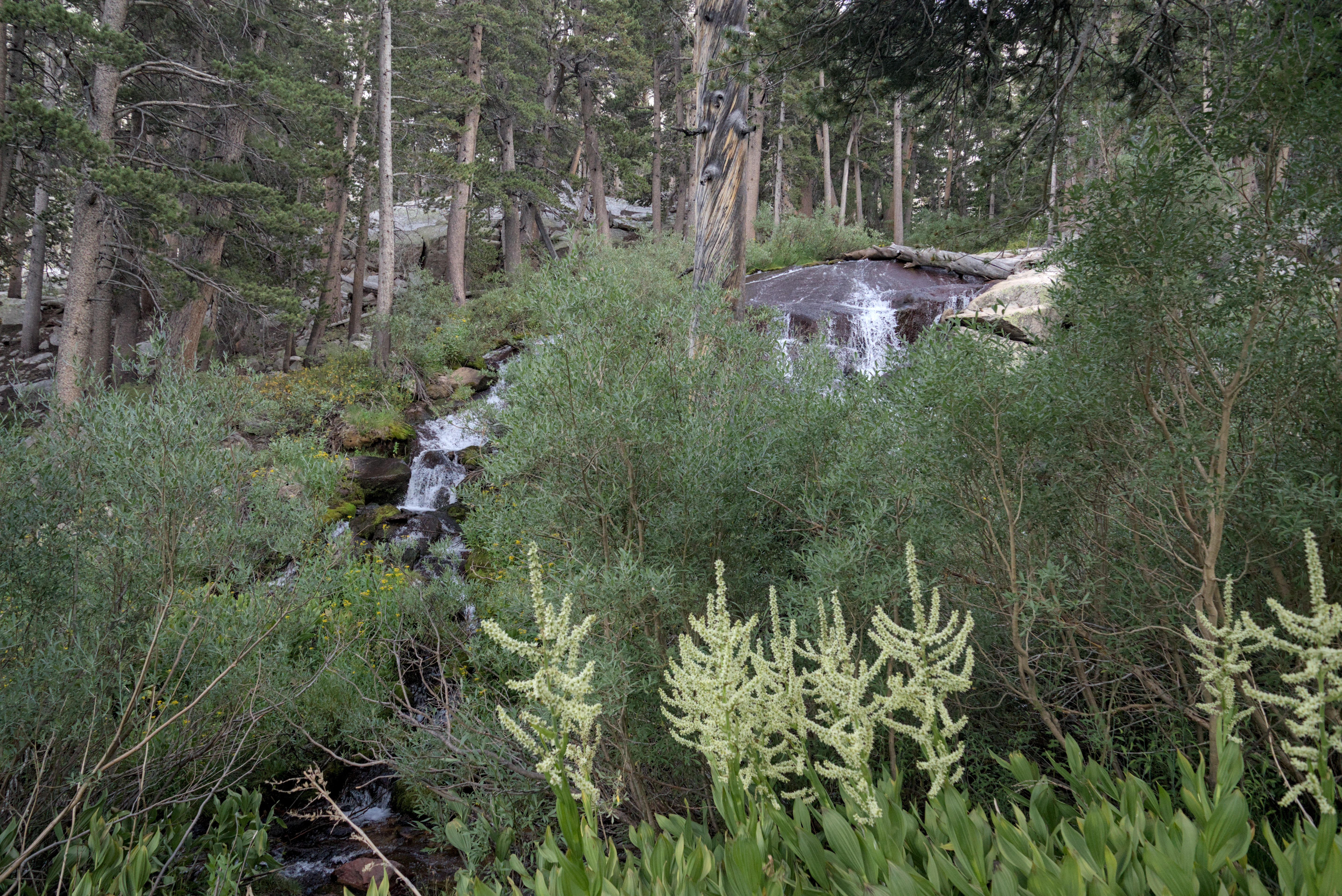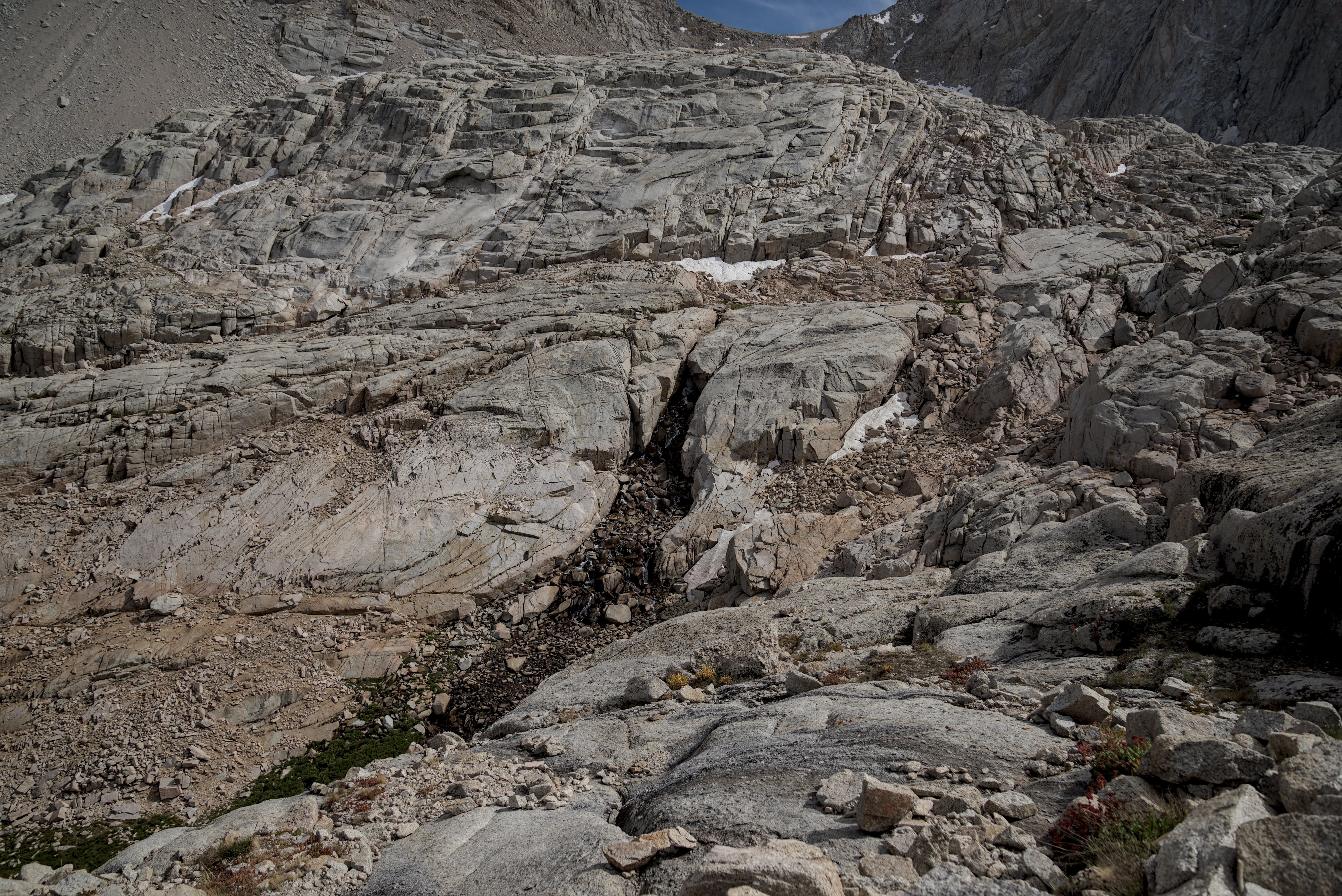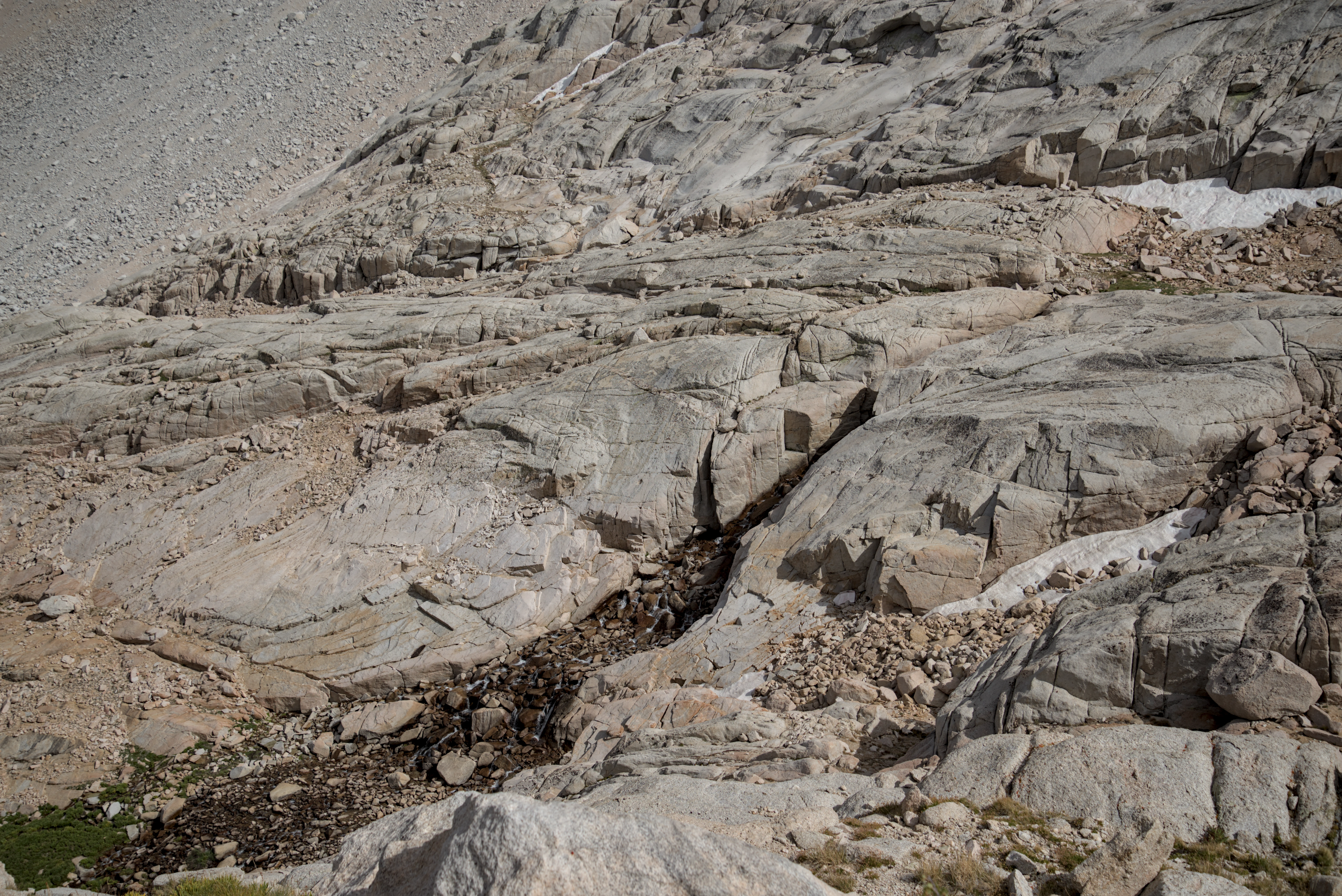 There is a spring about 2/3 of the way from Trail Crest to Trail Camp. This is a terrible picture of it. The idea was to show that it pops out between the last switchback and the one I'm standing on.